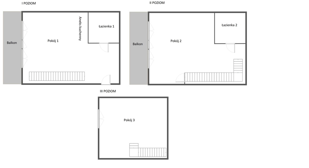Ciekawy układ pomieszczeń - 3 kondygnacje, na każdej znajduje się pokój sypialny/salon.