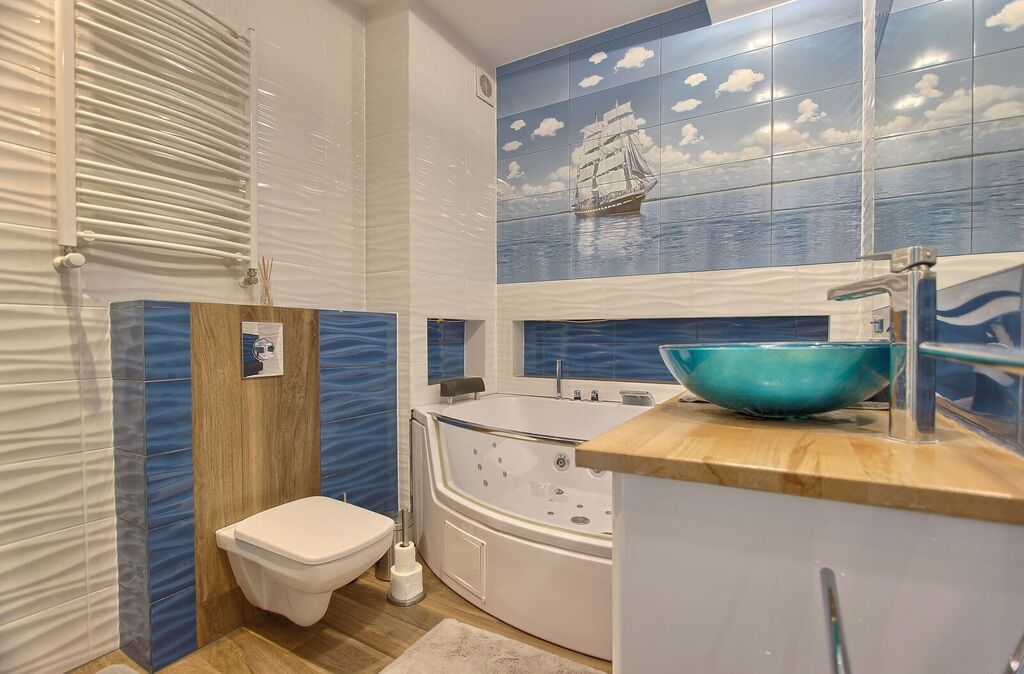 • duża łazienka z kabiną prysznicową i wanną z hydromasażem