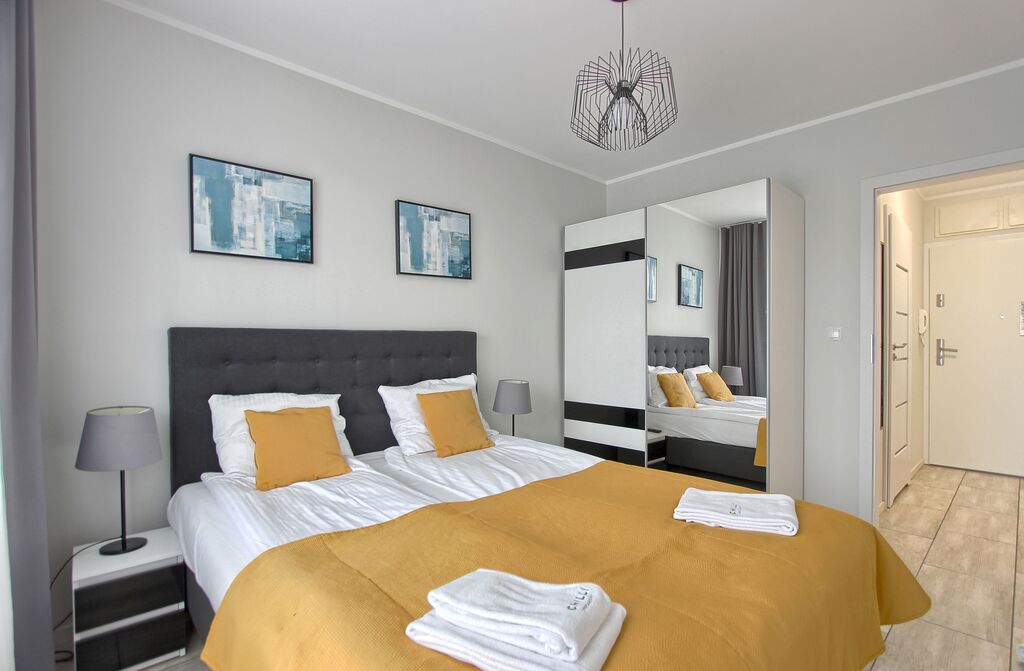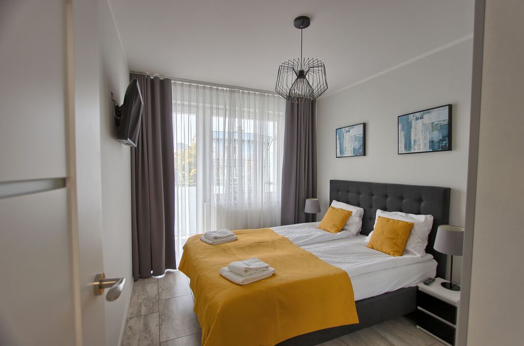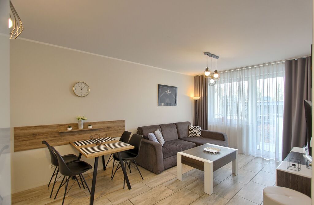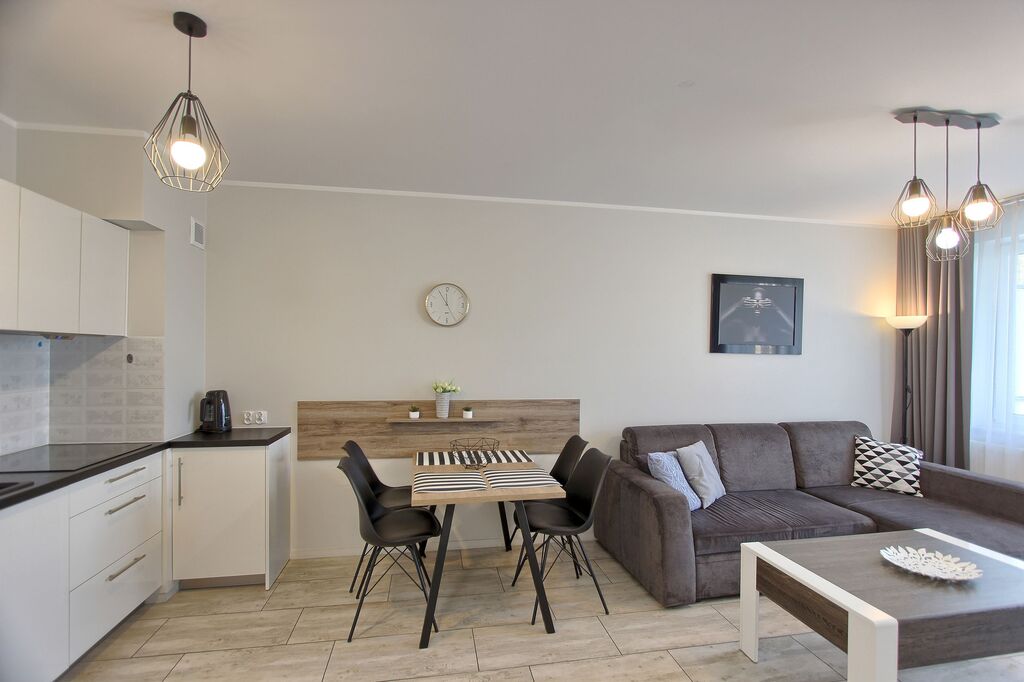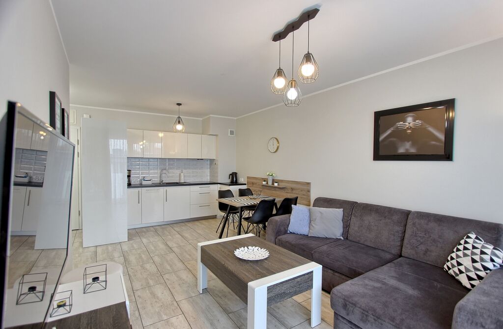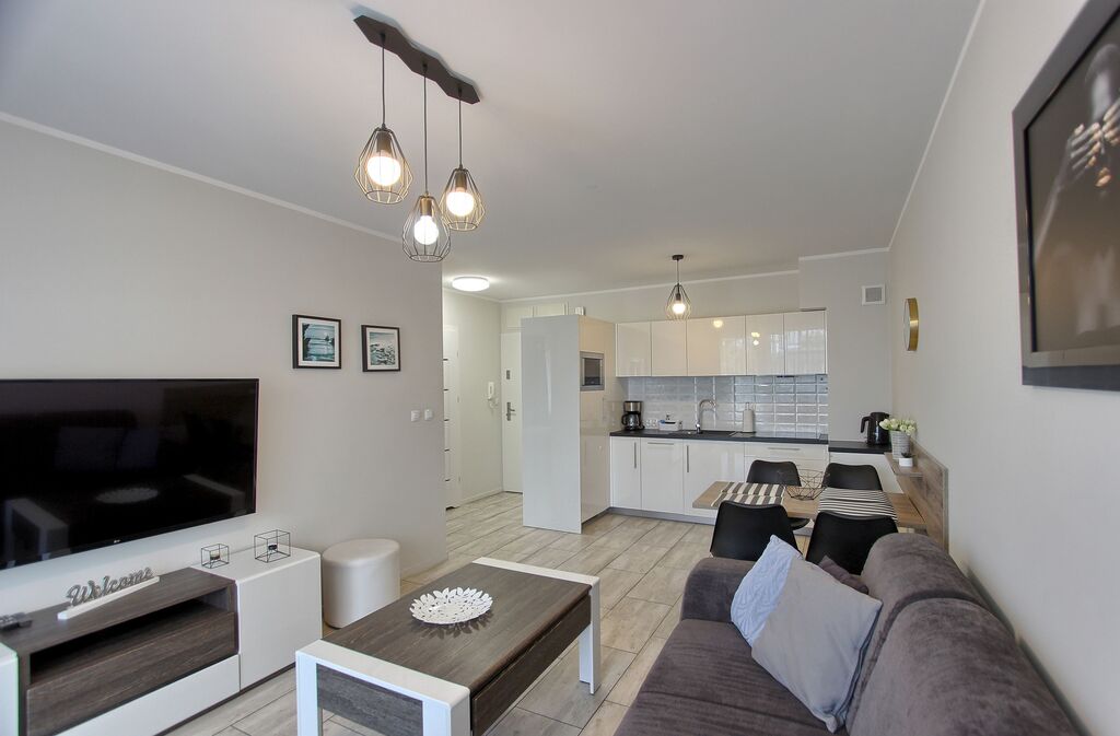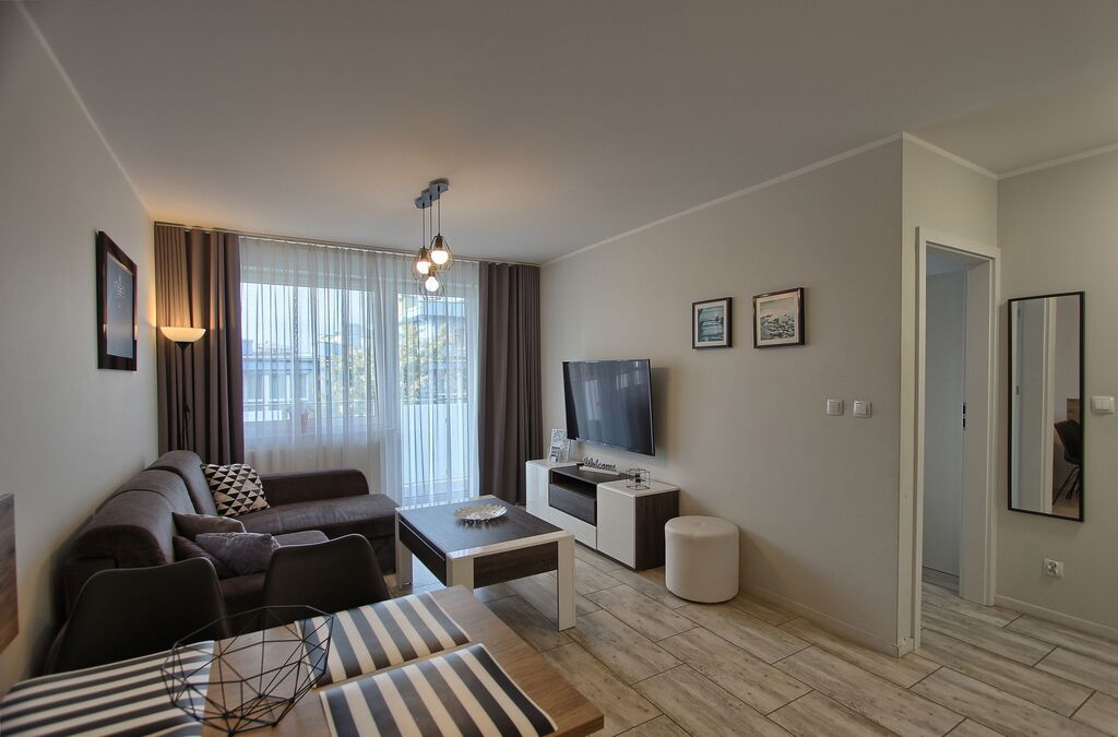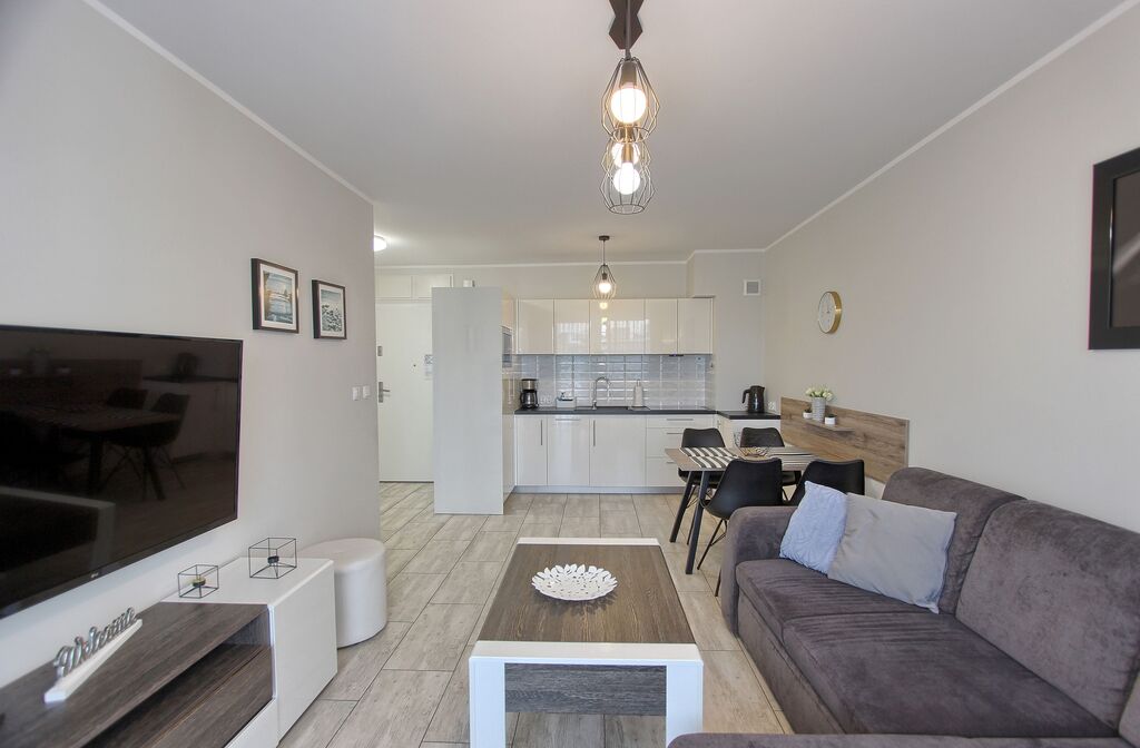 Apartament umeblowany, ładnie i wygodnie urządzony. Powierzchnia to prawie 38 m2. Składa się z salonu z rozkładaną kanapą, w pełni wyposażonego aneksu kuchennego oraz sypialni z łożem małżeńskim i łazienki z prysznicem. Dodatkowym atutem jest taras na który można wyjść z sypialni, jak i z salonu. W budynku znajduje się siłownia, rowerownia, a na dachu taras z leżakami. Teren obiektu jest ogrodzony. Budynek wybudowany przez solidnego kołobrzeskiego dewelopera, dobrze zarządzany. Koszty utrzymania to około 600 zł. Ogrzewanie i ciepła woda z sieci miejskiej.