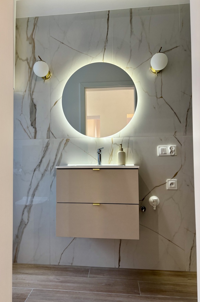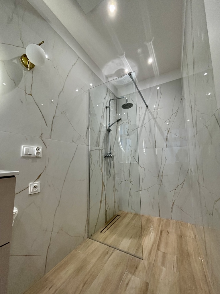 Stylowa łazienka –eleganckie kafle o dużym formacie, duży i wygodny prysznic z deszczownicą, miejsce na podłączenie pralki.