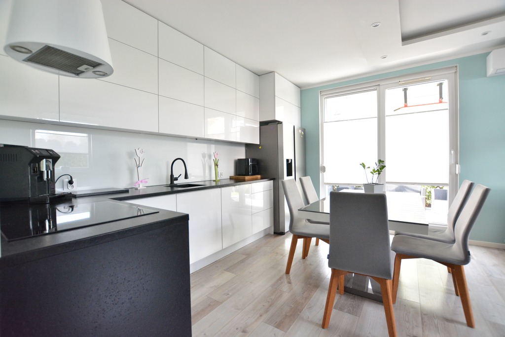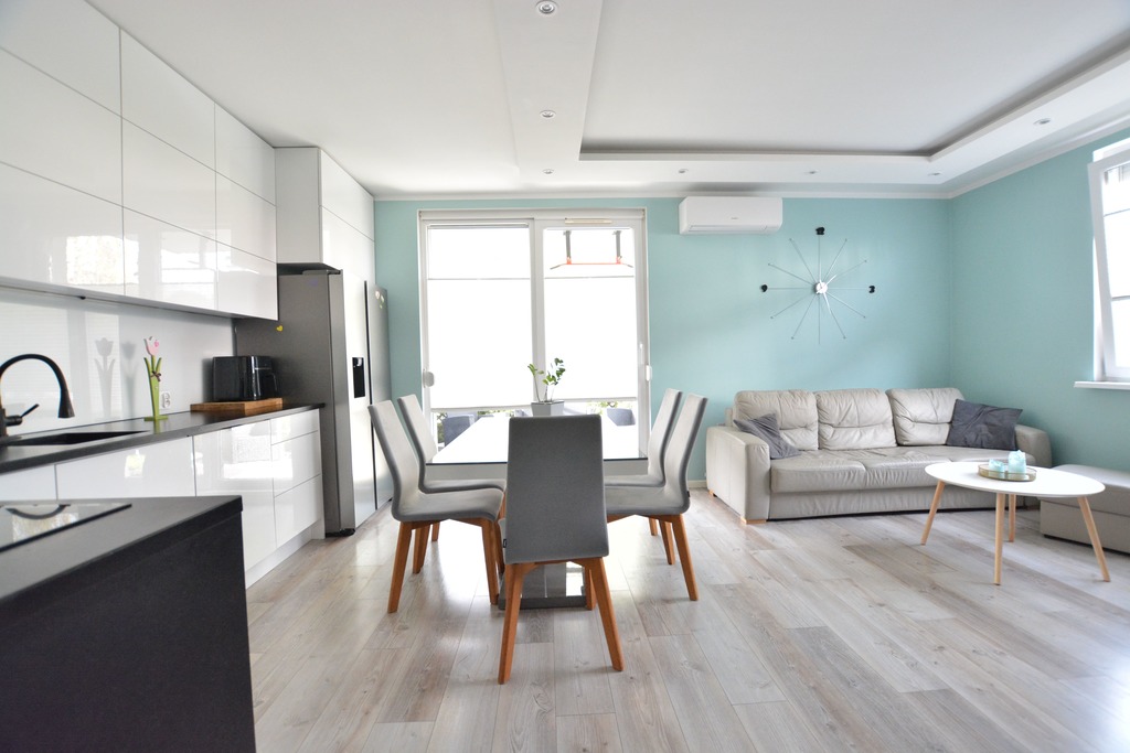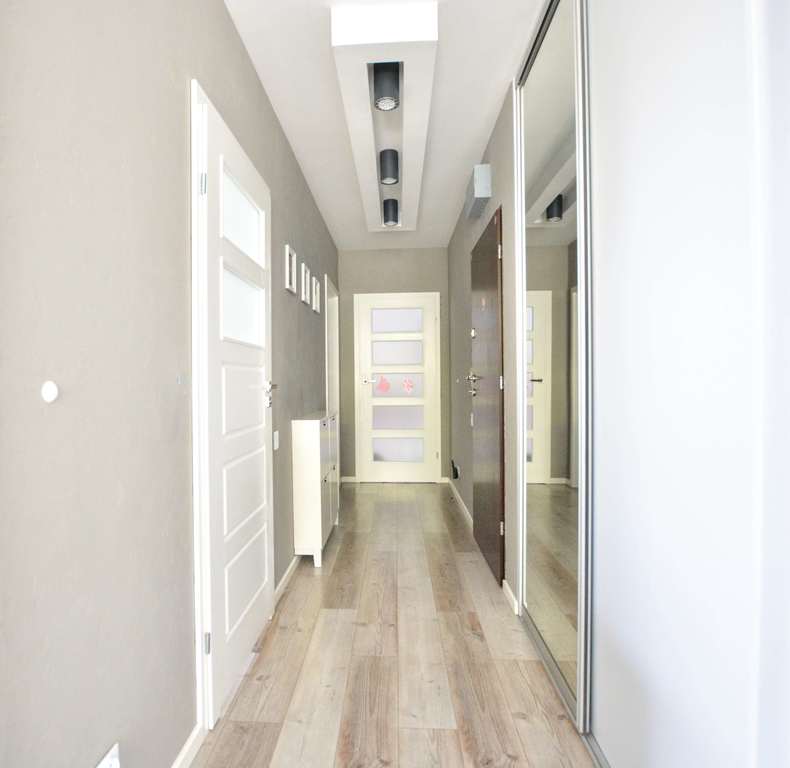Mieszkanie świeżo po generalnym remoncie. Standard wykończenia wysoki - w kuchni i łazience kamienne blaty, na ścianach beton architektoniczny, łazienka z oknem. Wszystkie okna mają zamontowane zewnętrzne rolety a wewnątrz zamontowane plisy. Podwieszane sufity z energooszczędnym ledowym bardzo dobrej jakości oświetleniem.