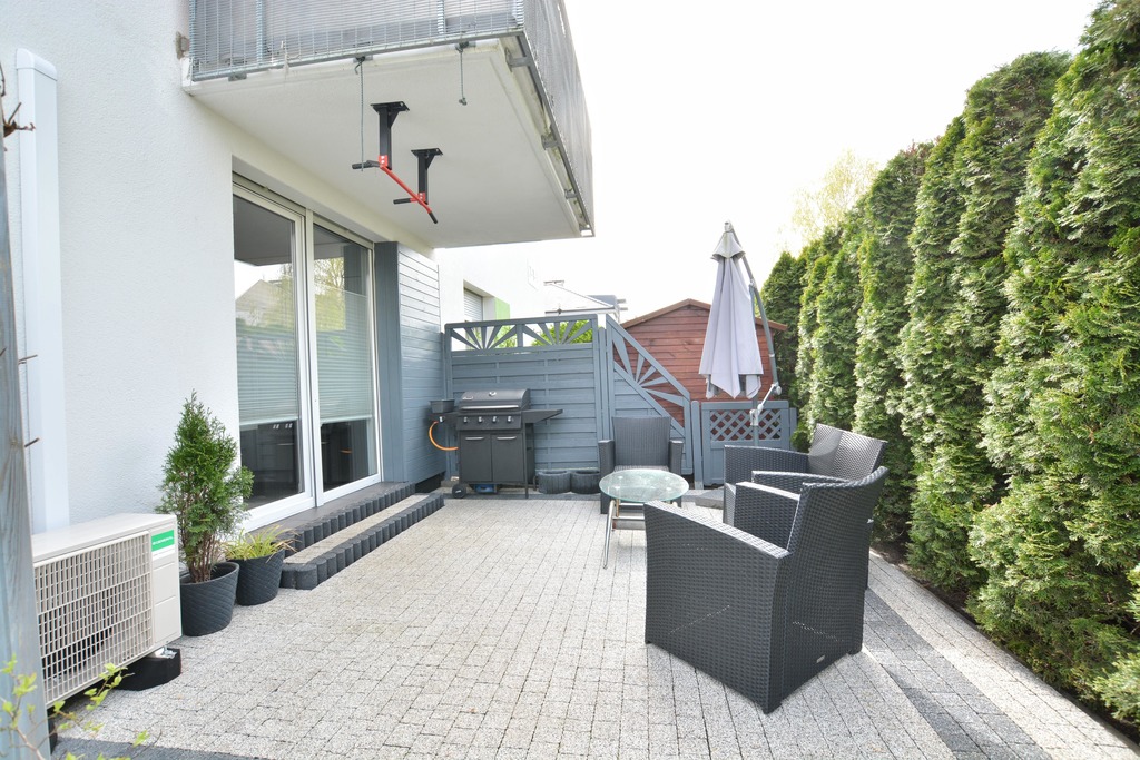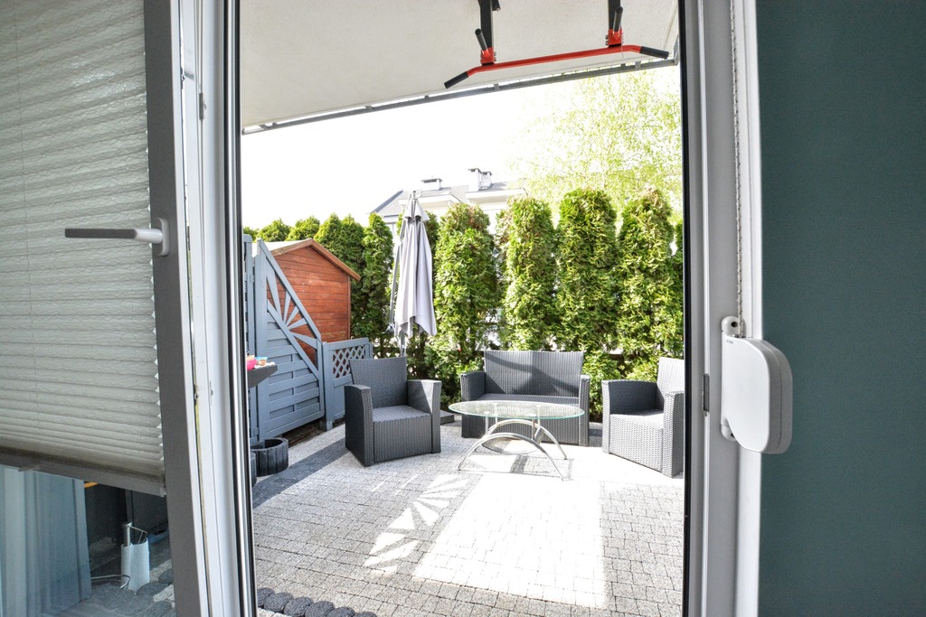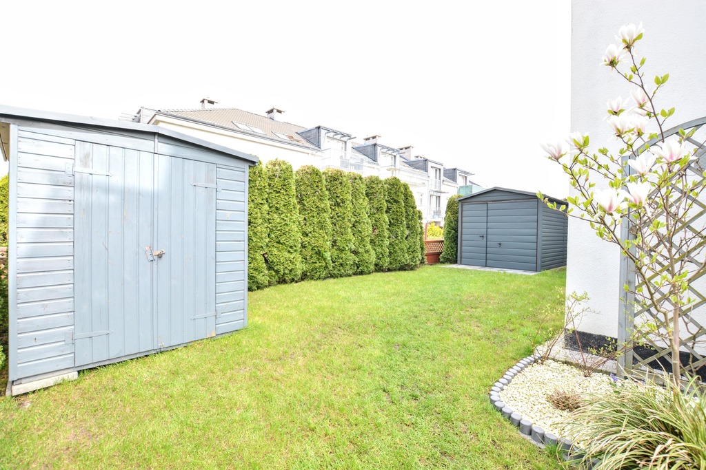 - ogród o powierzchni 120m z 20metrowym tarasem oraz 15m2 garażem i drewnianym domkiem narzędziowym. Ogród narożny z nasadzeniami tuj.