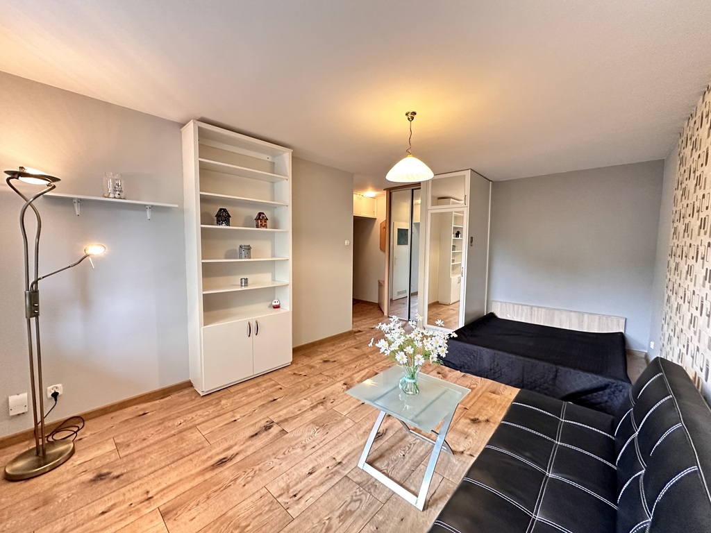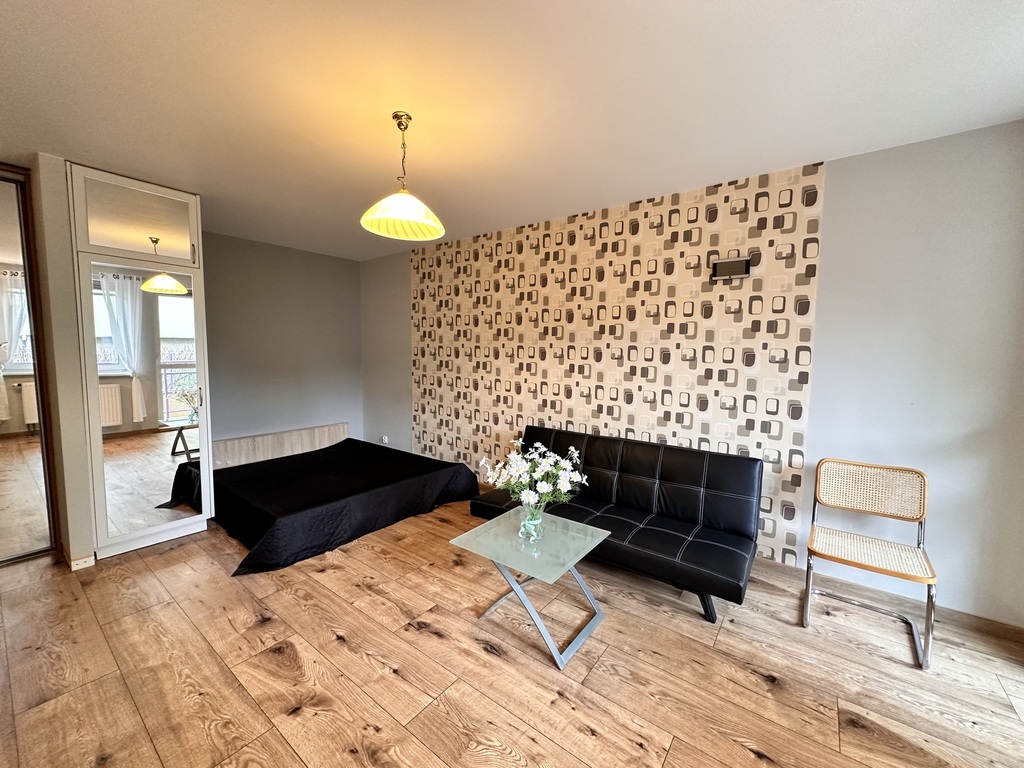 Na jego powierzchni znajduje się duży pokój z sypialnianą wnęką oraz częścią dzienną z wyjściem na balkon, oddzielna kuchnia z nową, ładną zabudową meblową i niezbędnym AGD, łazienka z WC, prysznicem i pralką oraz przedpokój z dużą szafą w zabudowie.