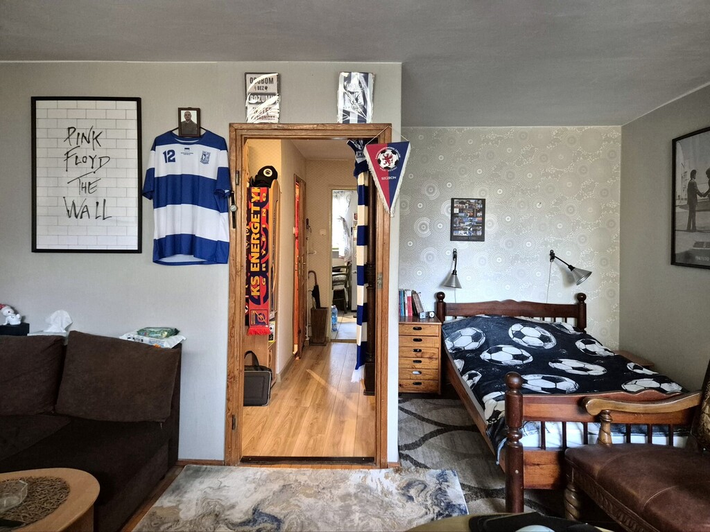 - uzyskanie salonu z aneksem poprzez połączenie kuchni i sypialni przy jednoczesnym podziale obecnego salonu na 2 sypialnie