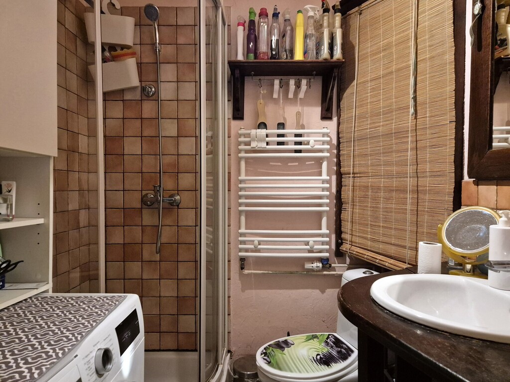 * łazienka z prysznicem, wc i umywalką z możliwością powiększenia
