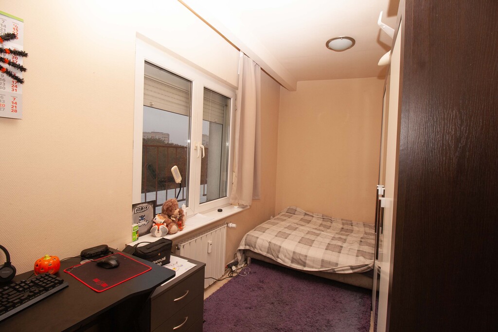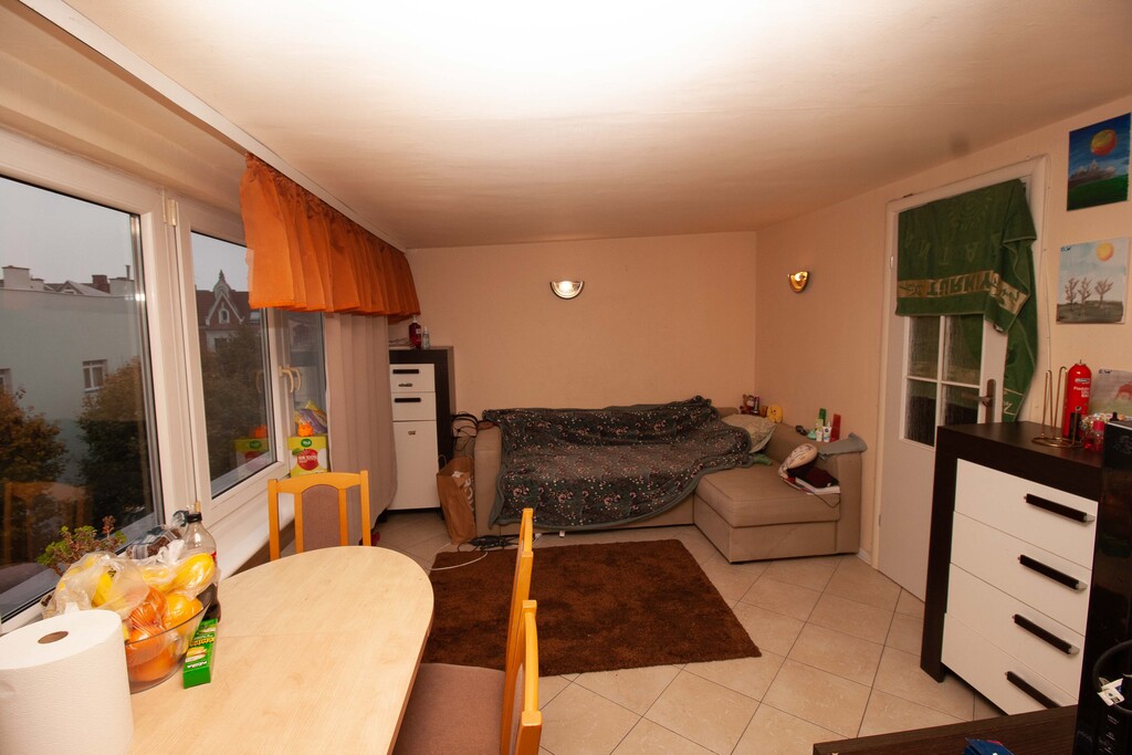 Pokój dzienny z aneksem kuchennym od podwórka, sypialnia z oknami na park.