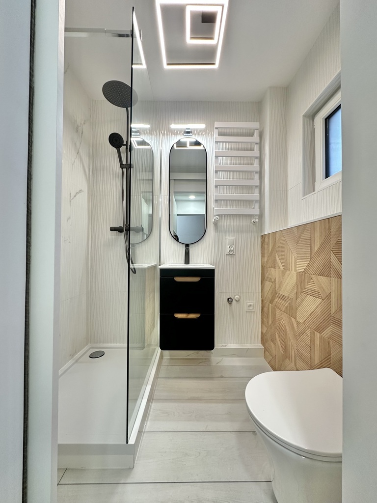 Kuchnia z meblami w zabudowie, Łazienka wyposażona w kabinę prysznicową.