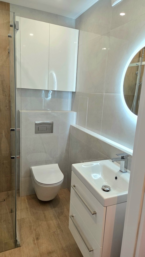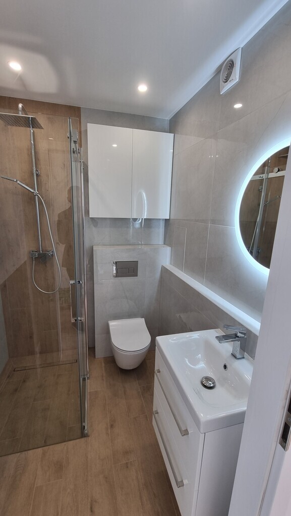 Stylowa ŁazienkaŁazienka zaprojektowana we współpracy z Leroy Merlin, wyposażona w ceramikę Cersanit, kabinę prysznicową oraz