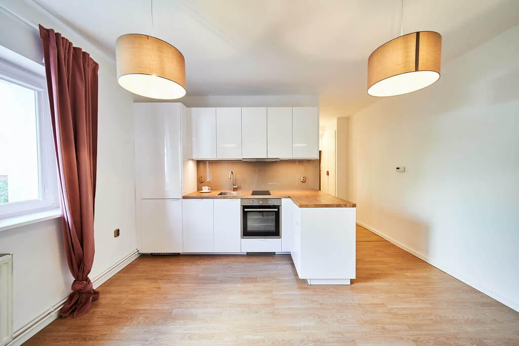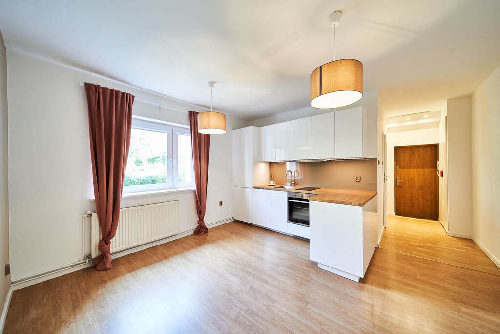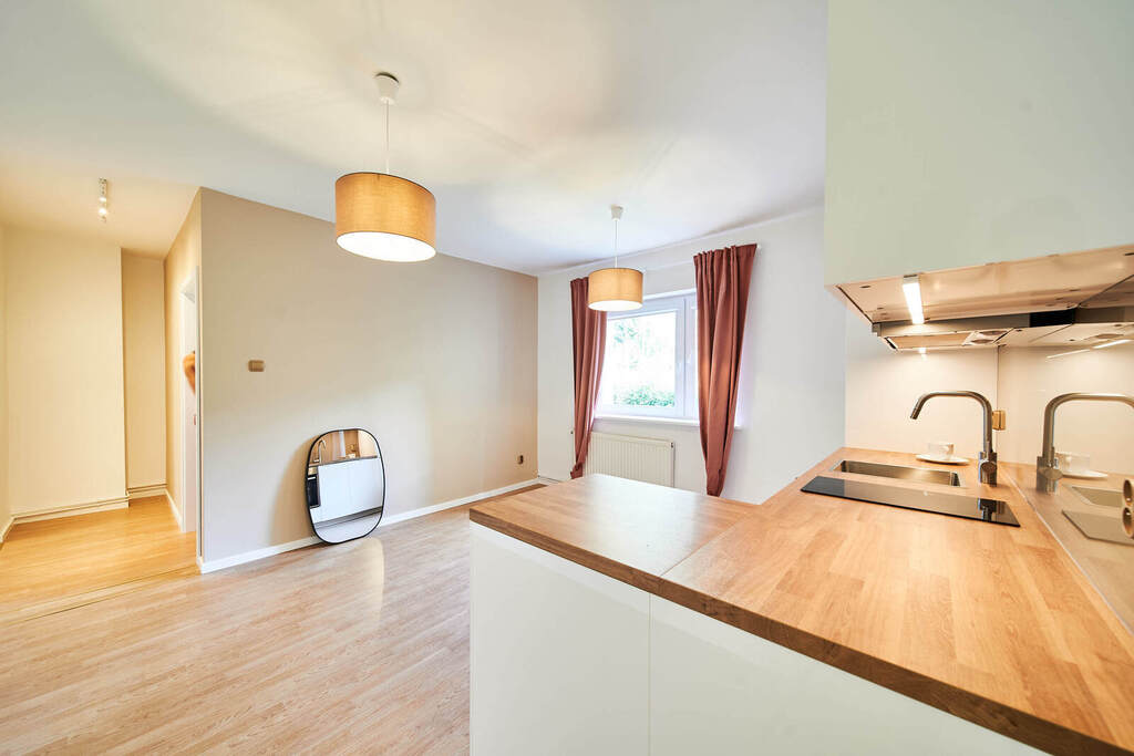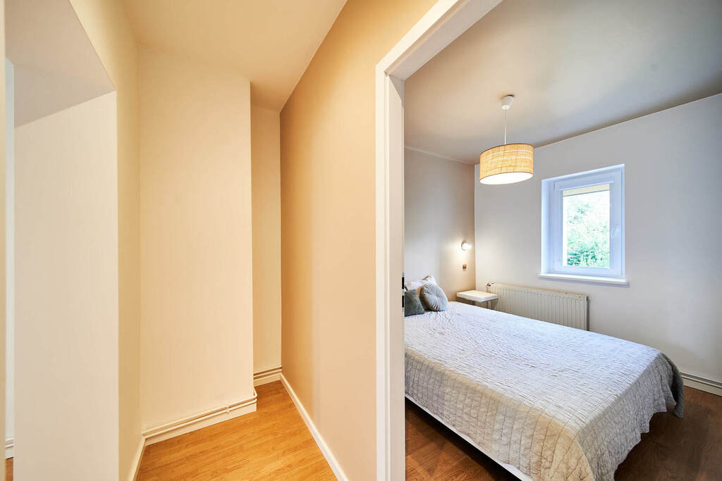 Nowa, kompleksowo wyposażona kuchnia zlakierowanymi frontami, łazienka z elegancką kabiną prysznicową, nowym piecem C.O z zabudową na pralkę oraz suszarkę. Okna PCV, nowe drzwi wewnętrzne.