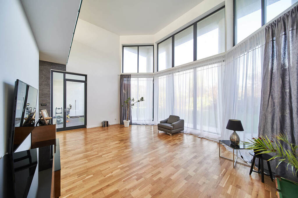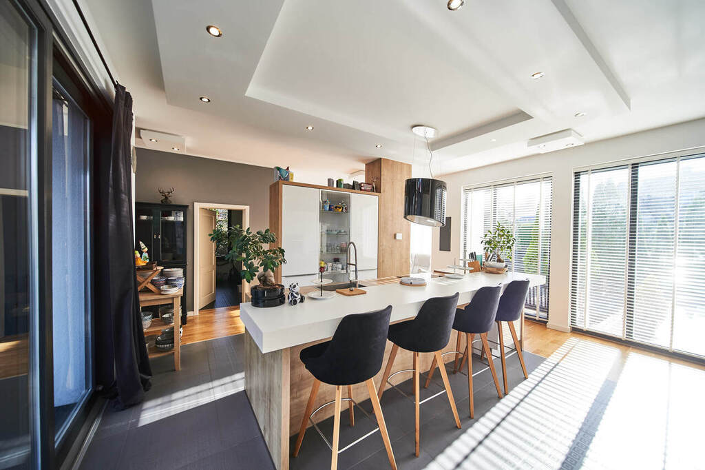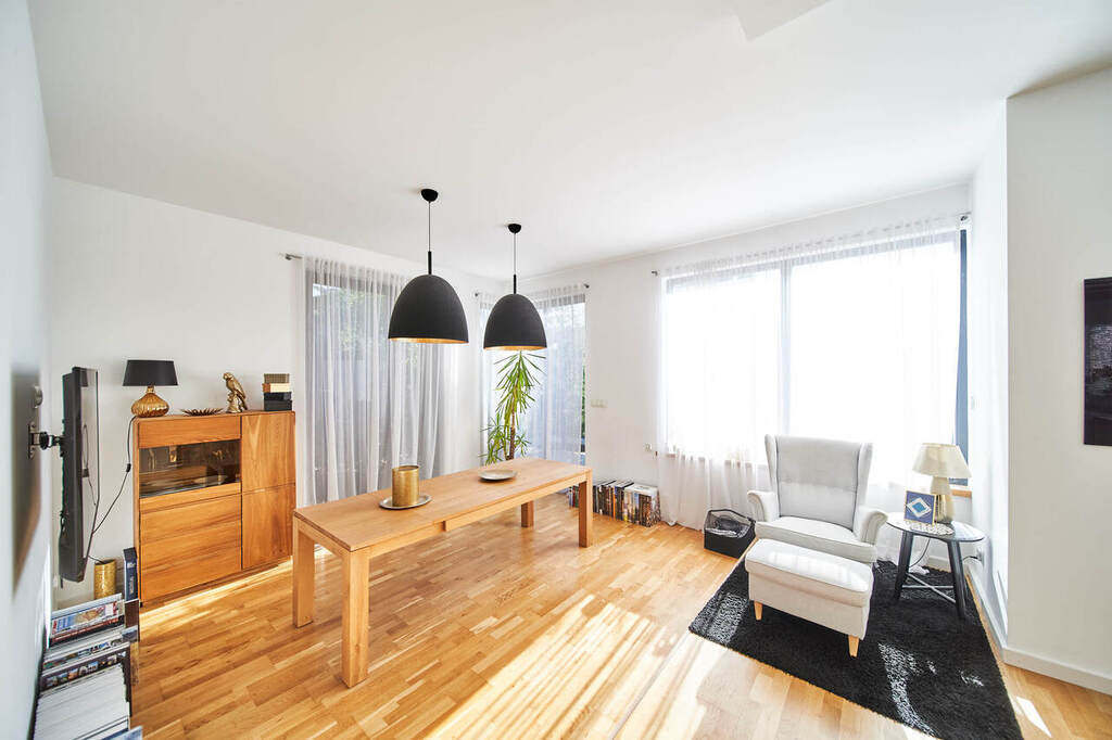 Wysoki standard wykończenia – naturalne materiały, dębowe podłogi, drewniane okna, kuchnia ze sprzętem premium.