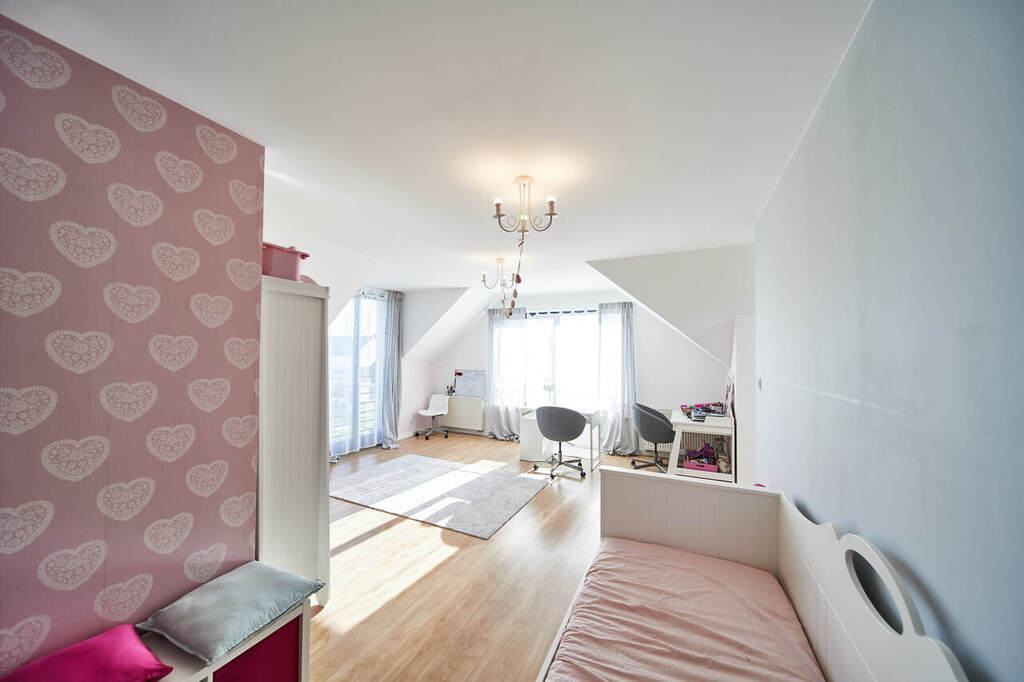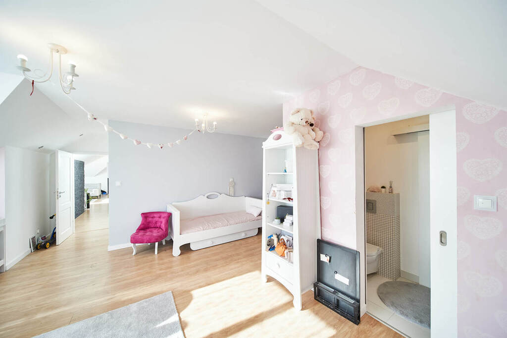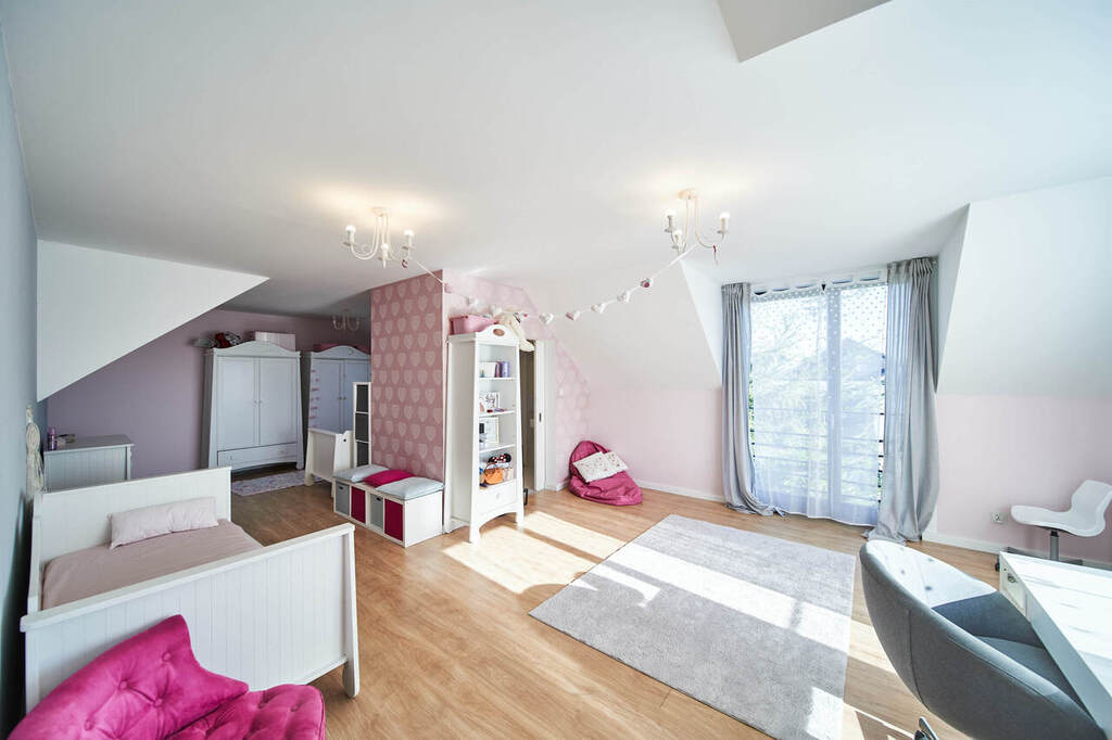 Na piętrze znajduje się strefa prywatna: główna sypialnia z prywatną łazienką i garderobą, kilka dodatkowych pokoi, przestronna bawialnia, a także niezależne mieszkanie z aneksem kuchennym i łazienką.