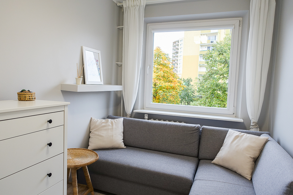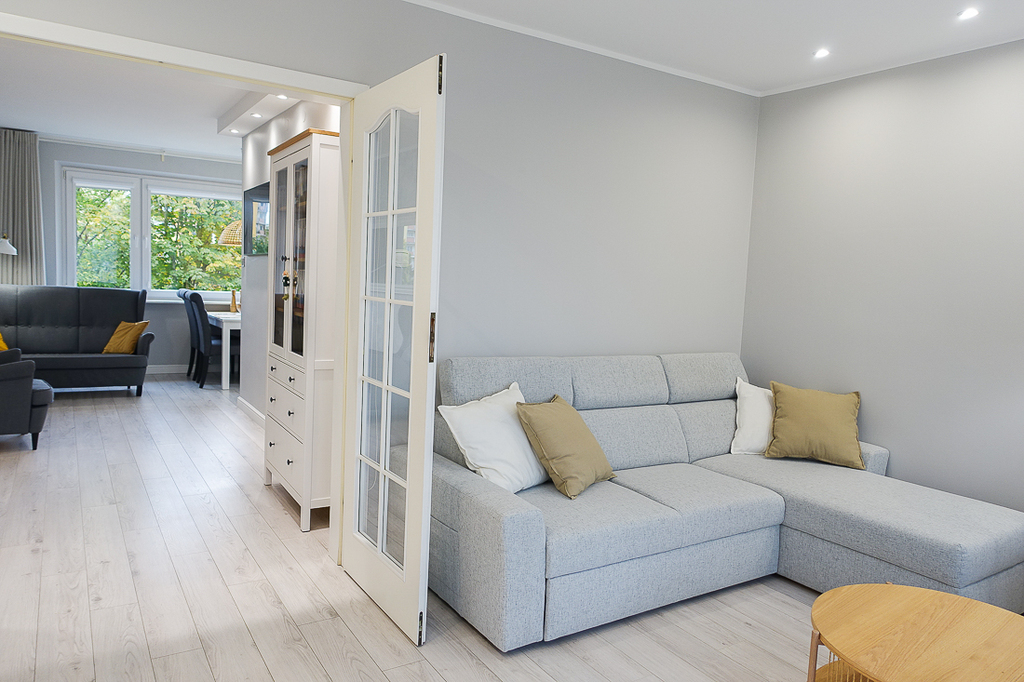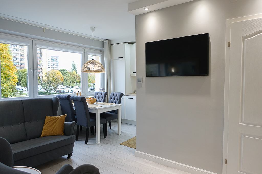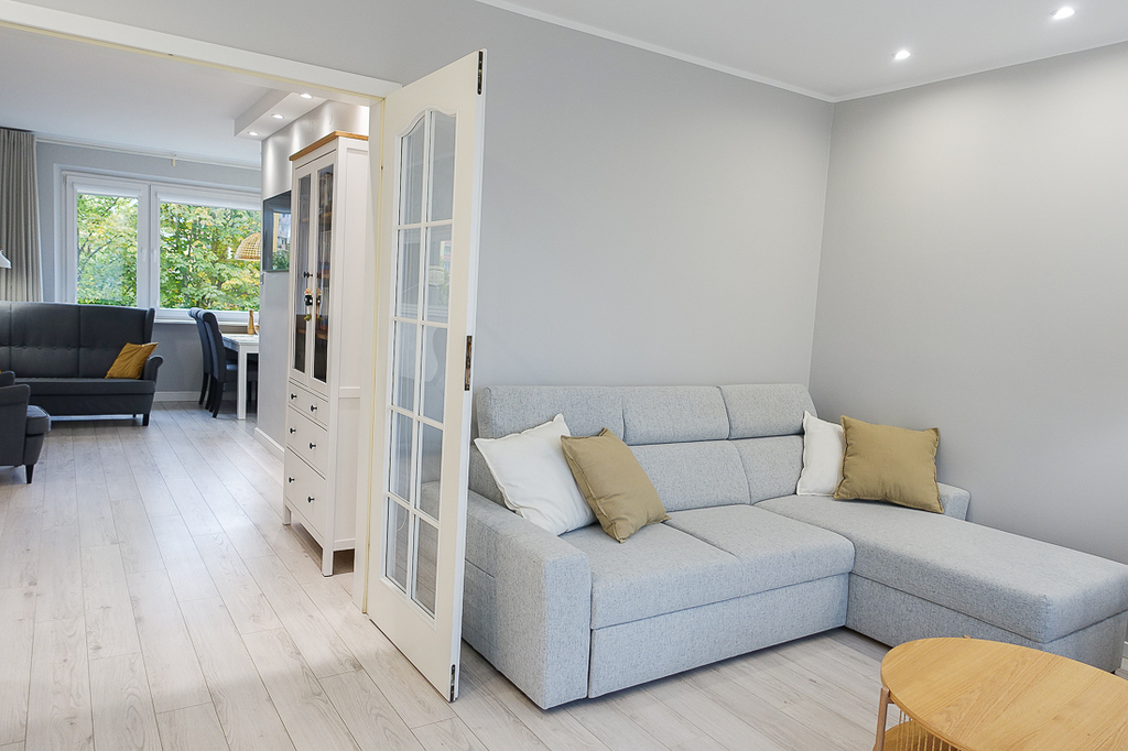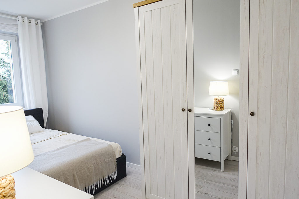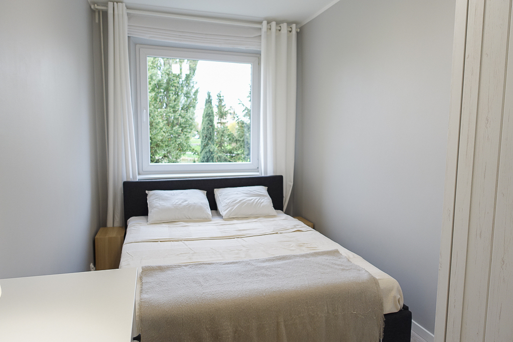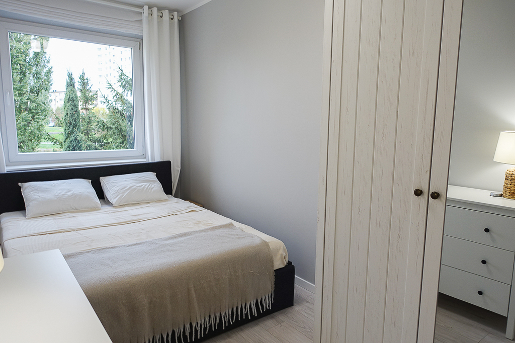 Nowe okna PCV, nowe podłogi, nowe meble i urządzenia. Nowa, jasna, nowoczesna stolarka drzwiowa. Ściany gładkie, malowane.
