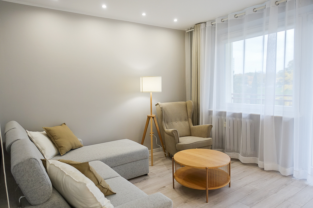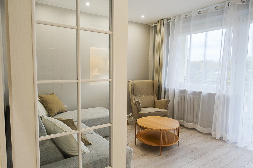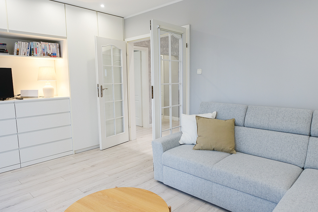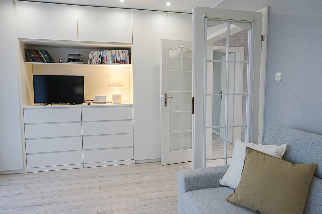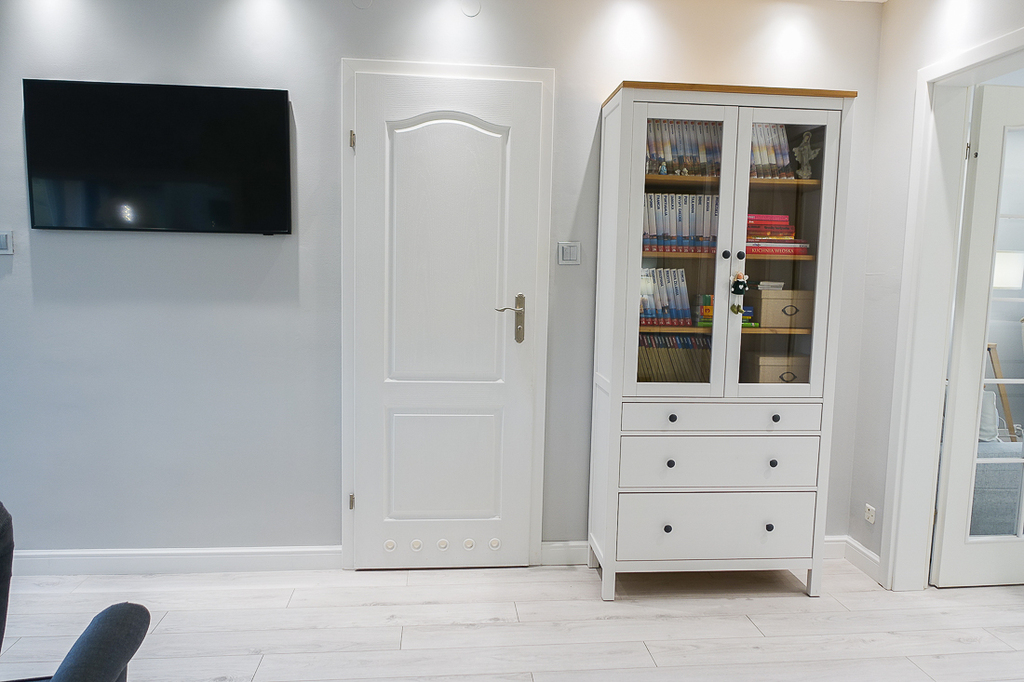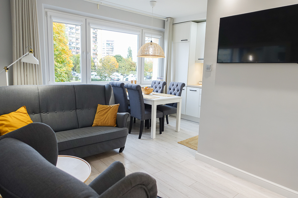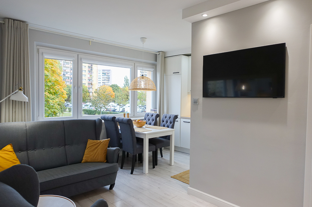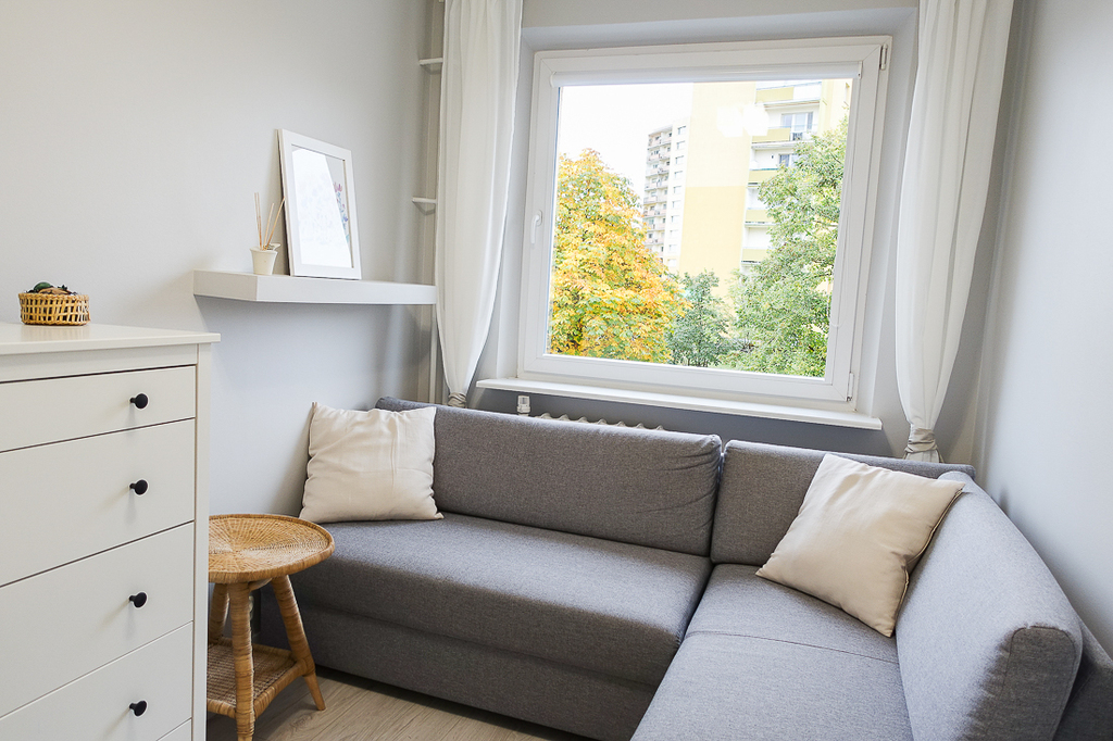 Nowe okna PCV, nowe podłogi, nowe meble i urządzenia. Nowa, jasna, nowoczesna stolarka drzwiowa. Ściany gładkie, malowane.
