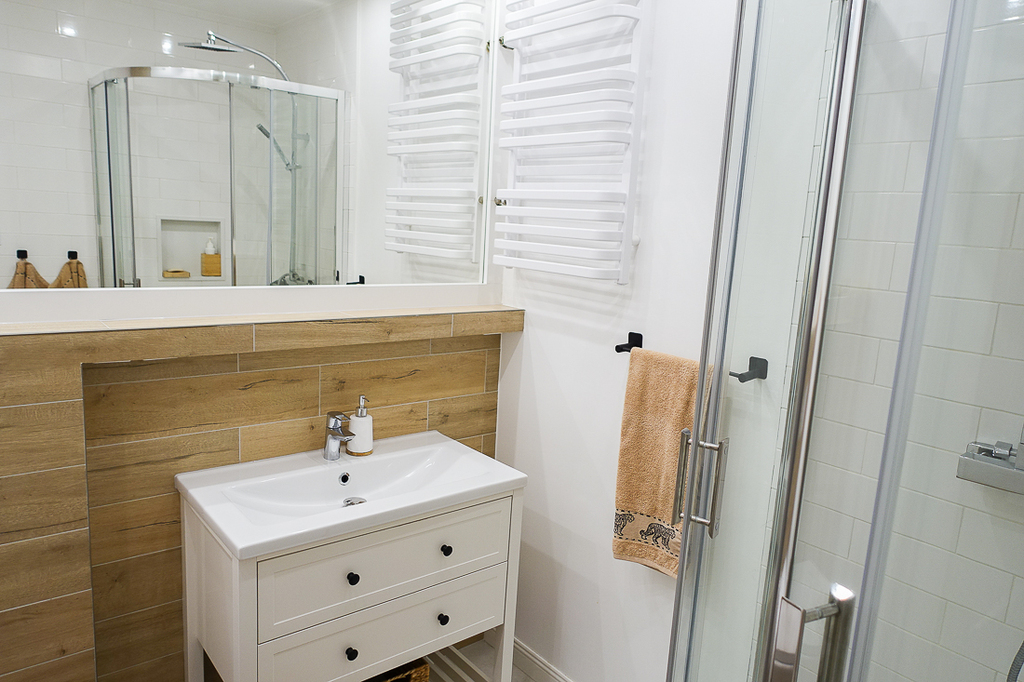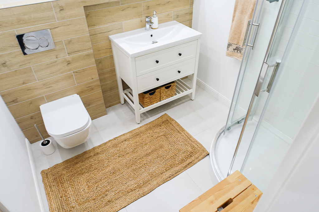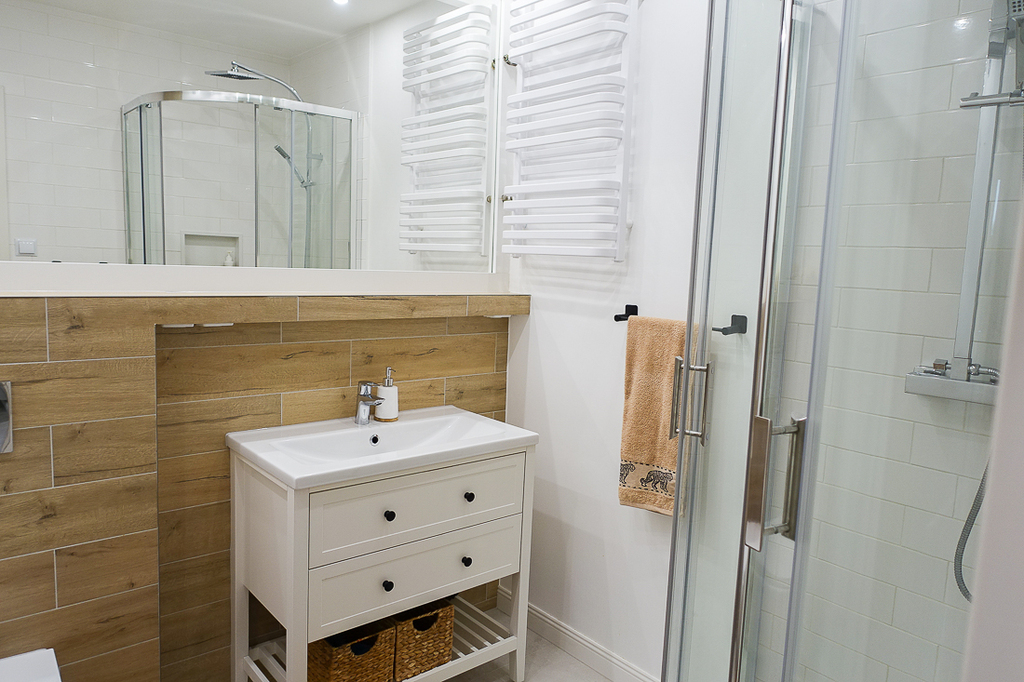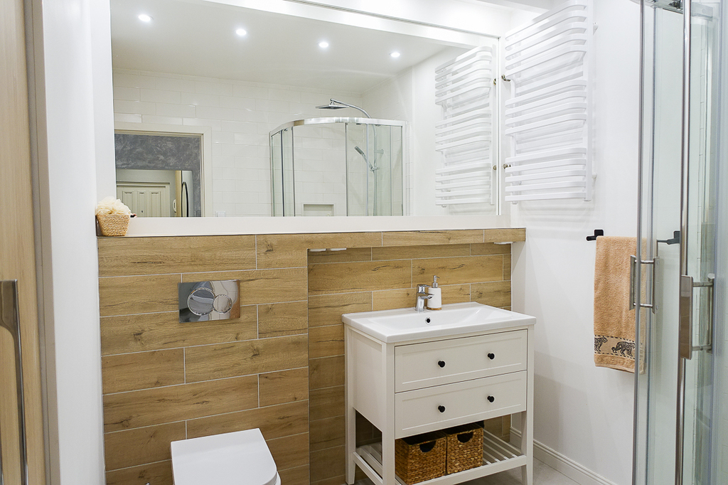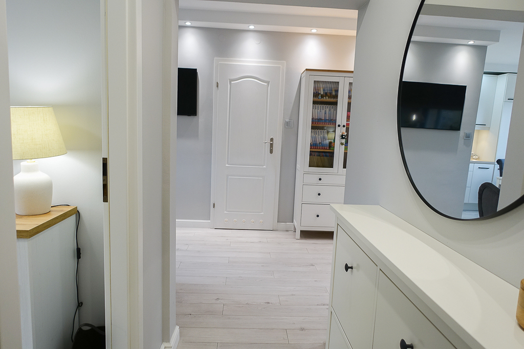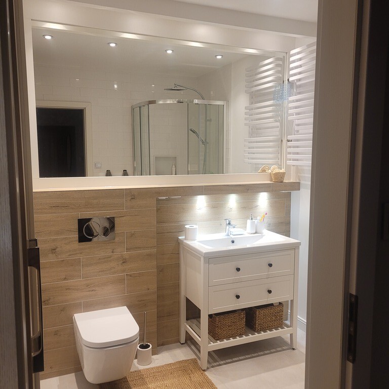 Łazienka po remoncie kapitalnym w niej kabina prysznicowa, WC z systemem GEBERIT, duże lustro, umywalka z szafką, ponadto zabudowa w niej pralka, półki na ręczniki, chemię gospodarczą itp. jest to miejsce, w którym może zainstalować suszarkę na pranie. Łazienka powstała z połączenia łazienki i WC o powierzchni po modernizacji 4,7 m2.