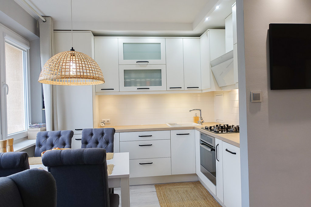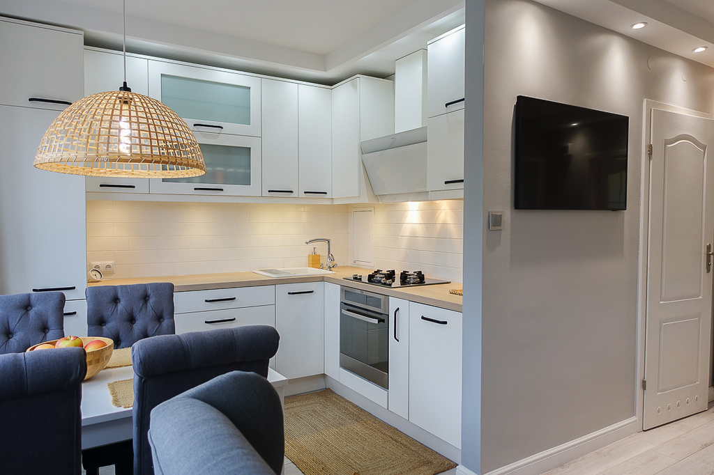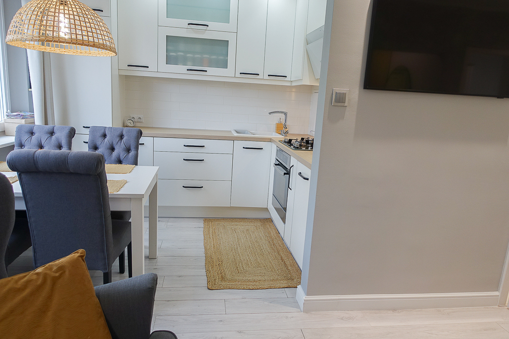 pokój z aneksem kuchennym, wygodną jadalnią, w kształcie litery L o powierzchni 16,8 m2 powstały z połączenia pokoju i kuchni z oknem, można powrócić do poprzedniego układu i powstanie pokój i oddzielnie kuchnia z oknem. Kuchnia z nową zabudową meblową w niej zmywarka, kuchenka gazowa z piekarnikiem elektrycznym, nowoczesny, biały pochłaniacz, lodówka z zamrażarką w zabudowie.