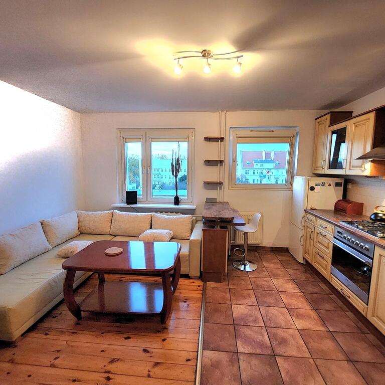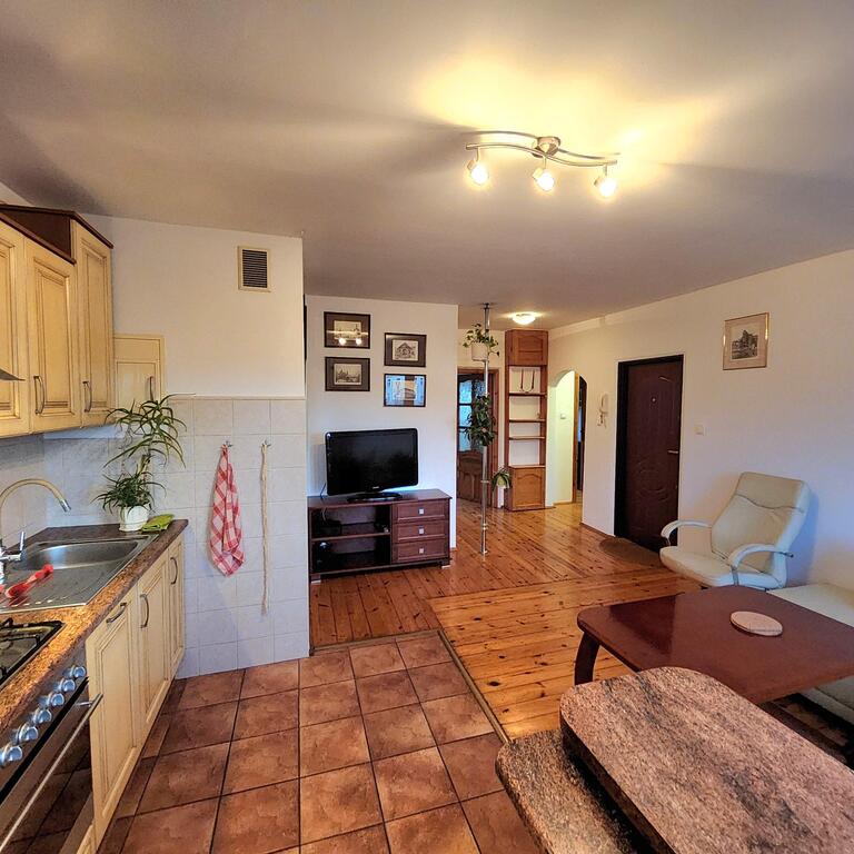 Do wynajęcia mieszkanie 3 pokojowe usytuoawane na 4 piętrze 5-piętrowego bloku. Na powierzchni 64m2 znajdują się : salon z aneksem kuchennym o łącznej powierzchni ok 20m2, duża sypialnia z wyjściem na balkon, mniejszy ok 10m2 pokój oraz łazienka z wc. W mieszkaniu znajduje się dużo pojemnych szaf. Jest ono wpełni wyposażone w meble i sprzęt AGD ( pralka, lodówka, zmywarka, TV ). Ściany malowane, na podłodze deska drewniana i terakota, okna PCV. Mieszkanie jest bardzo ciepłe i przytulne.