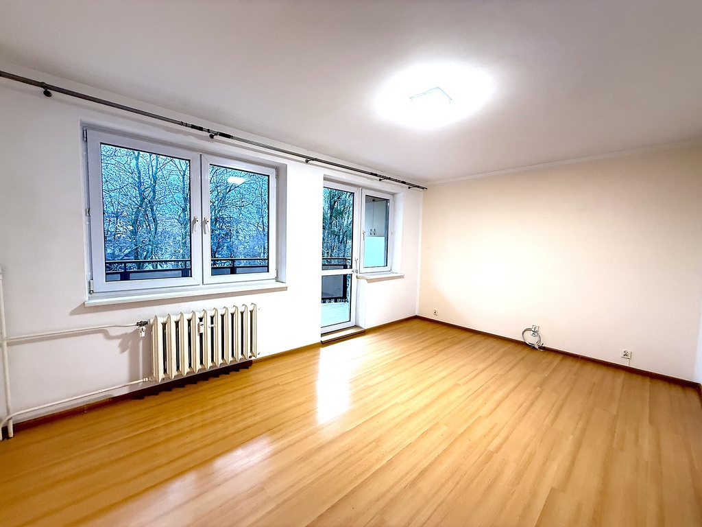 Salon o powierzchni około 19m2 z wyjściem na bardzo duży balkon z widokiem na zieleń.