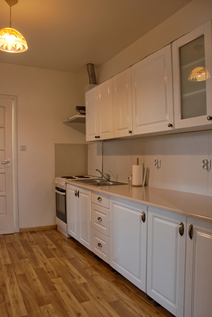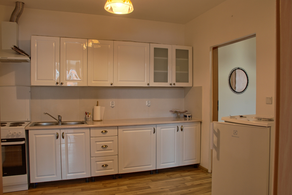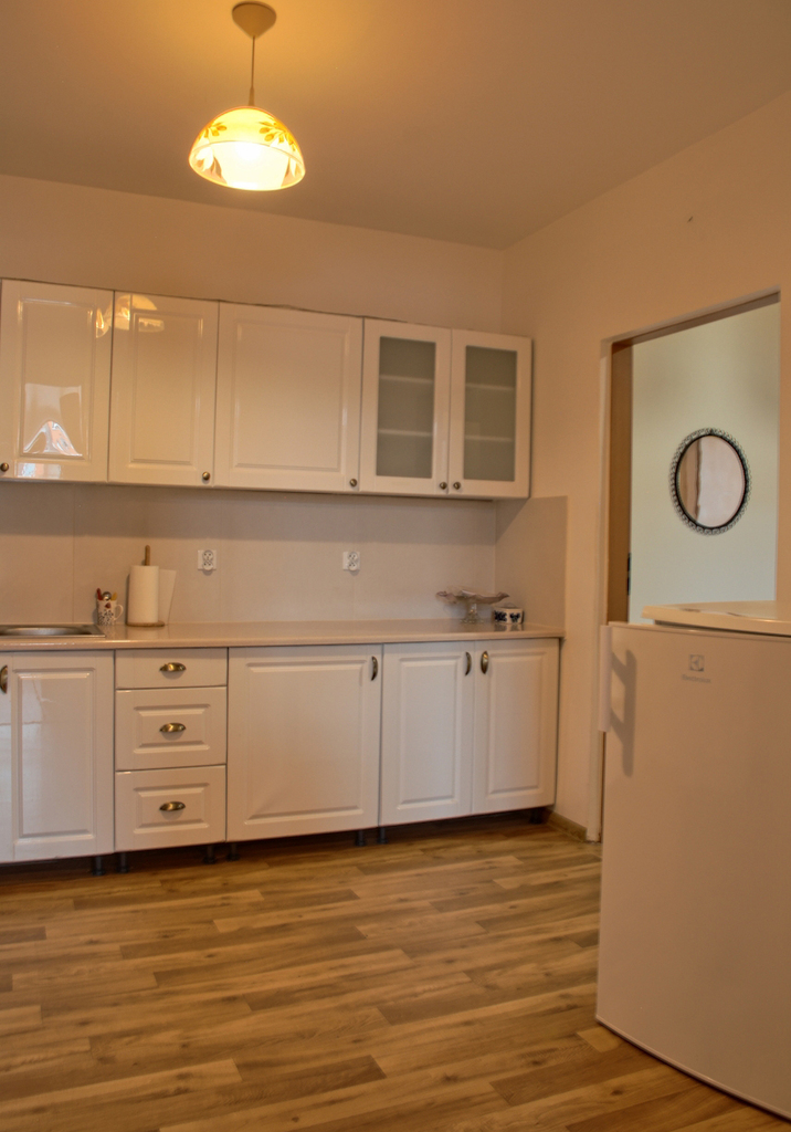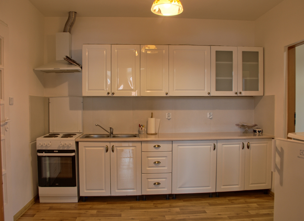 Kuchnia wyposażona jest w kuchenkę elektryczną z piekarnikiem, pochłaniacz, nowe białe meble kuchenne i lodówkę .