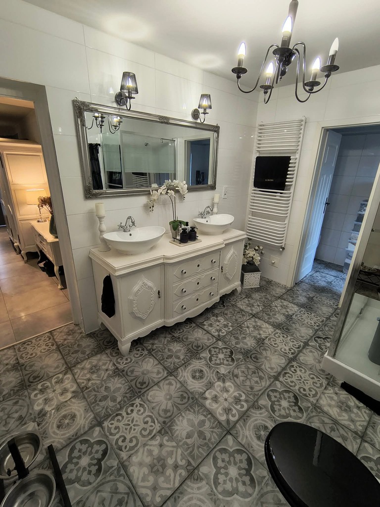 W łazience – duży prysznic i stylowa dębowa komoda z dwiema umywalkami.