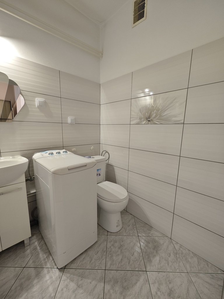 Mieszkanie składa się z obszernego salonu z wyjściem na duży balkon, osobno kuchni z oknem (wejście do kuchni z pokoju), łazienki z toaletą oraz przedpokoju. W pokoju panele na podłodze, ściany malowane. W pokoju stół plus cztery krzesła, rozkładana kanapa oraz całkiem nowe meble - szafa, słupek z miejscem na wieszaki i dwoma szufladami oraz komoda RTV (dwie szafki i trzy szuflady) plus telewizor. W kuchni panele na podłodze plus częściowo glazura na jednej ze ścian. W kuchni całkowicie nowe umeblowanie (szafki góra i dół) plus całkowicie nowy sprzęt AGD (lodówka firmy Beko, zmywarka firmy Whirlpool, kuchenka gazowo-elektryczna firmy Gorenje) plus stolik i dwa taborety. W łazience nowsza glazura i terakota plus obudowana kafelkami wanna, umywalka z szafką i lustrem, pralka firmy Candy oraz muszla. W przedpokoju nowa szafa na ubrania plus starszy wieszak i szafka na buty.