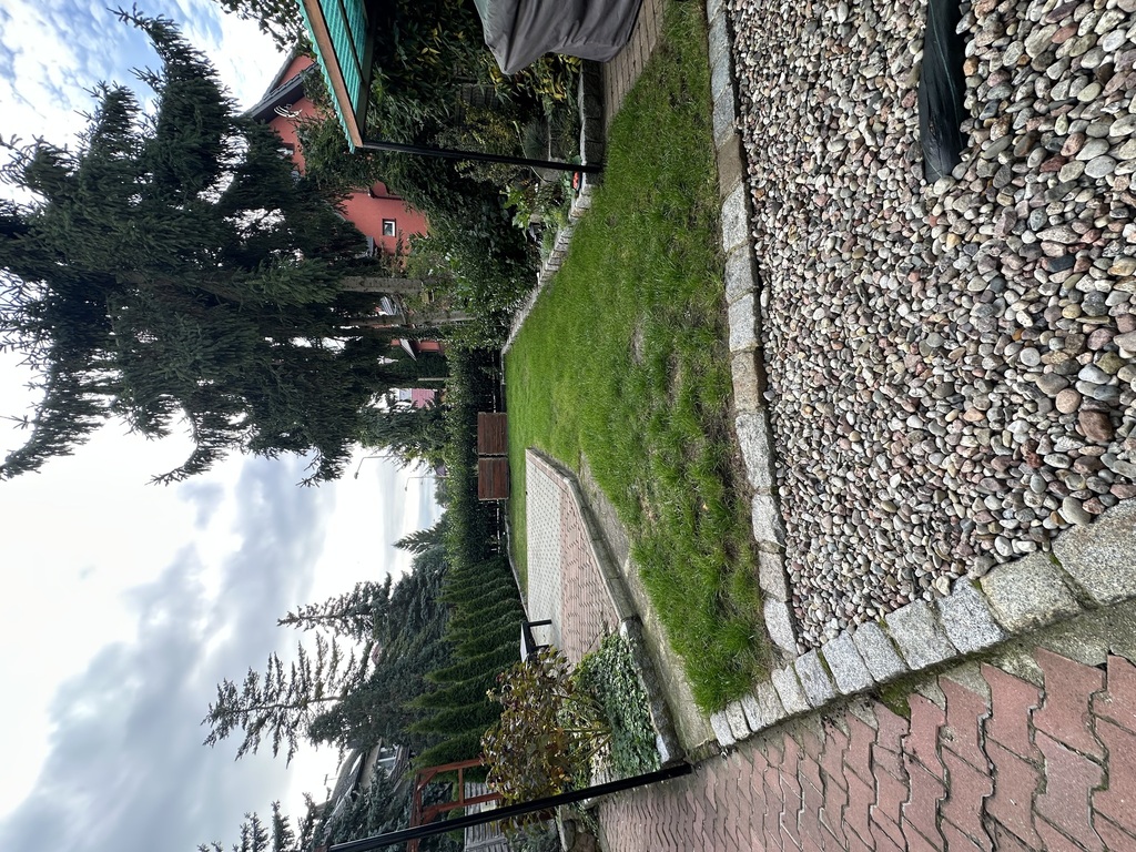 •ogród z zadbanym trawnikiem, krzewami i drzewami owocowymi, otoczony żywopłotem zapewniającym prywatność i ciszę.