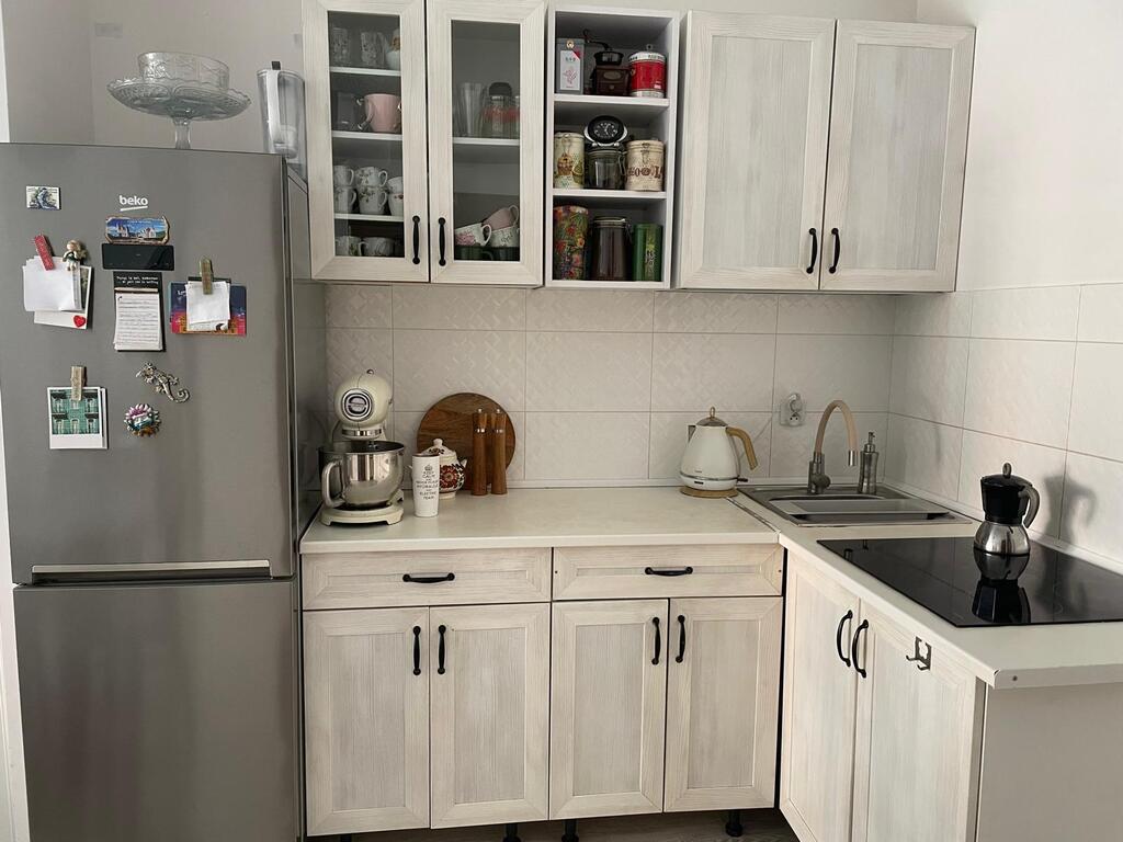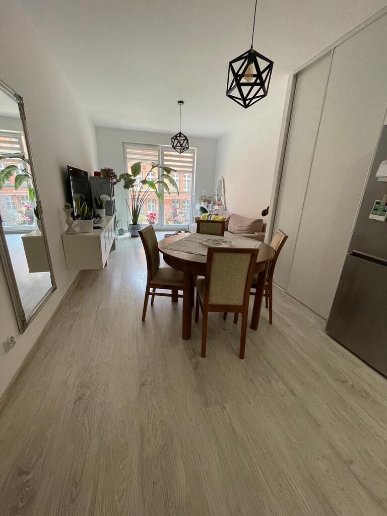 Na powierzchnię mieszkania składa się duży pokój z aneksem kuchennym, oddzielony szafą wybudowaną na wymiar, jest miejsce na stół z krzesłami, łazienka z wanną i pralką, wnęka na szafę przy wejściu.