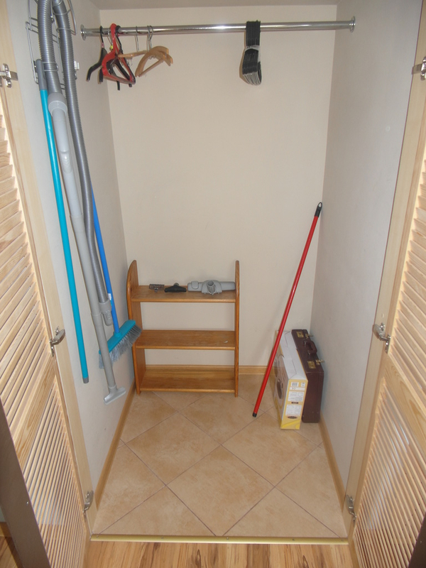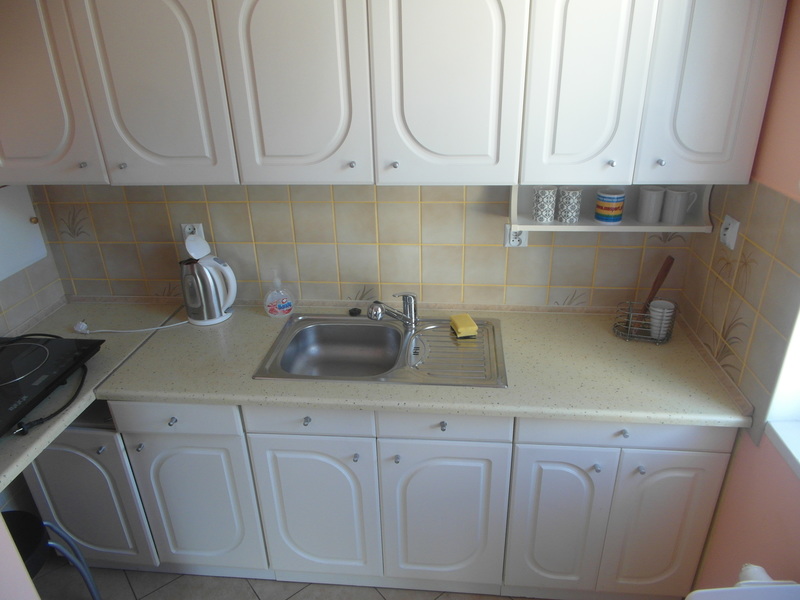 Mieszkanie składa się z większego pokoju o powierzchni 15m2 z wyjściem na duży balkon, maleńkiej sypialni 5m2, osobno kuchni 5m2 z oknem, łazienki z toaletą oraz przedpokoju. Mieszkanie oferowane jest do wynajmu po gruntownym remoncie. W pokojach na podłodze nowe panele, ściany gładzone i pomalowane w delikatnym kolorze (jedna ze ścian wykończona ozdobnym tynkiem strukturalnym). W większym pokoju znajduje się nowa, rozkładana kanapa dwuosobowa, stolik z telewizorem, dwie komody z szafkami i szufladami oraz obszerna szafa. W mniejszym pokoju znajdują się dwa regały z witrynami (typu POP) i łóżko. W kuchni nowe kafle na podłodze i fartuch kafelek na ścianach plus: umeblowanie wykonane na wymiar w kolorze waniliowym, nowsza lodówka (na zdjęciu widoczna jeszcze starsza), nowa kuchenka indukcyjna, pochłaniacz oraz czajnik elektryczny. W łazience kafle na podłodze i kafelki na ścianach plus: kabina prysznicowa, umywalka z blatem i szerokim lustrem wtopionym w kafelki oraz kinkietami, muszla podwieszana na geberycie. W przedpokoju kafle na podłodze (plus nowy wieszak na ubrania - na ścianie).