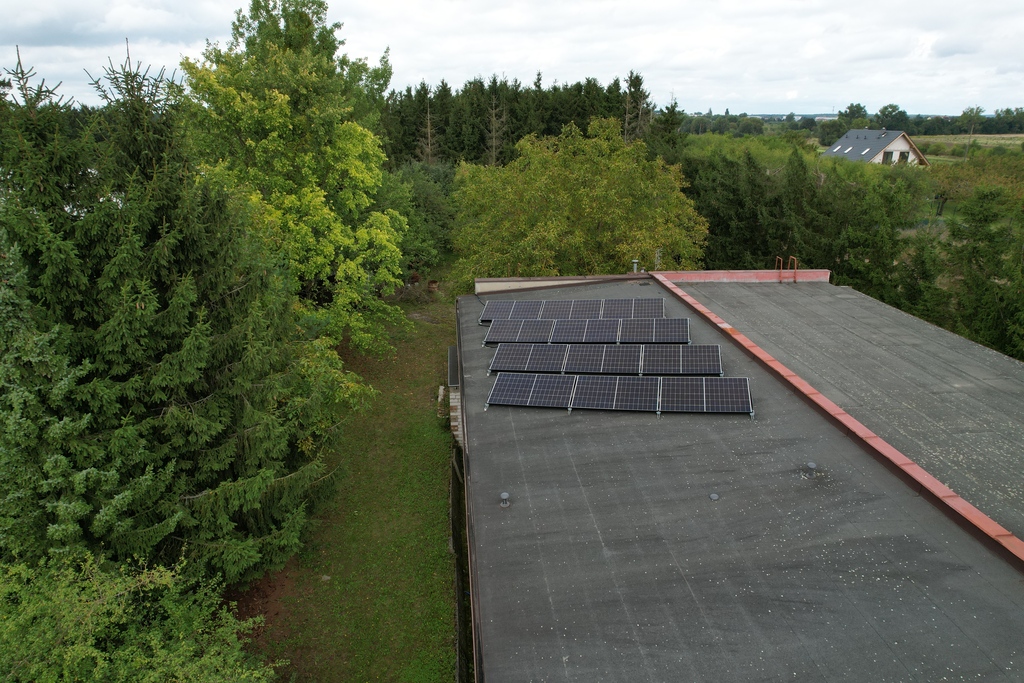 Budynek kryty dachem płaskim z warstwą papy. Możliwość podwyższenia budynku.