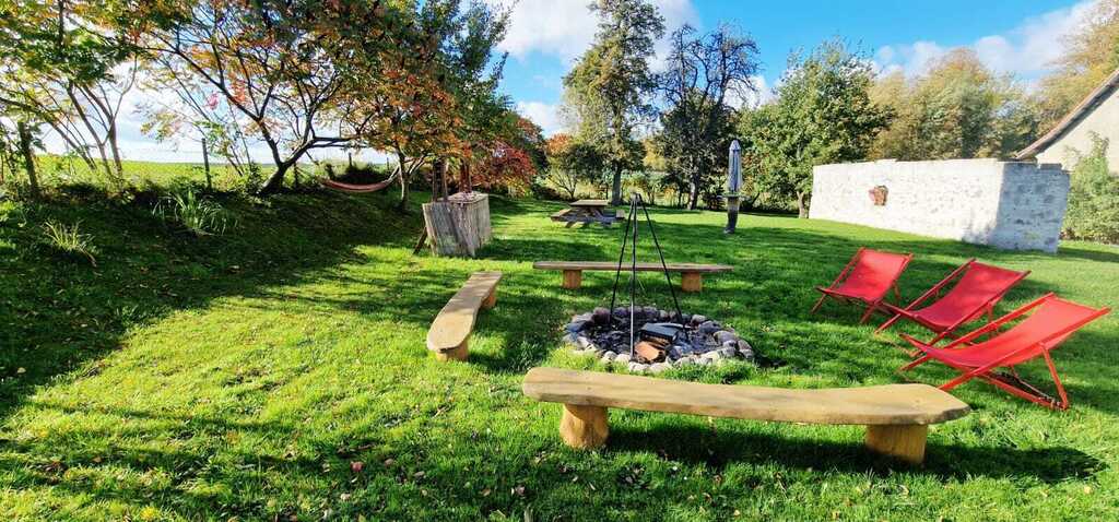 Wokół domu rozciąga się zielony, zadbany ogród, pełen kolorów i kwiatów – z altaną do relaksu, miejscem na ognisko, drewnianymi ławkami i przestrzenią idealną na przyjęcia w plenerze.