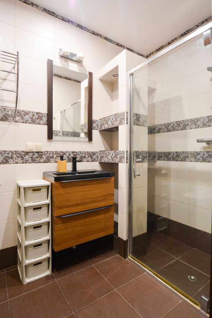 Łazienka z kabiną natryskową, umywalką. W korytarzu szafa w zabudowie Komandor.