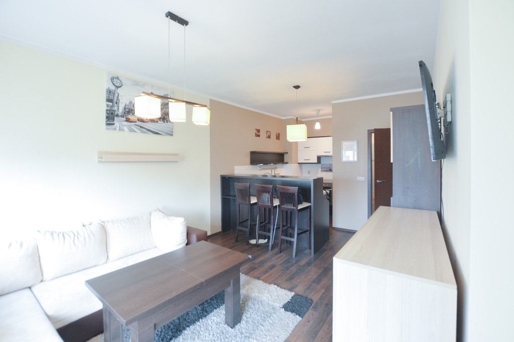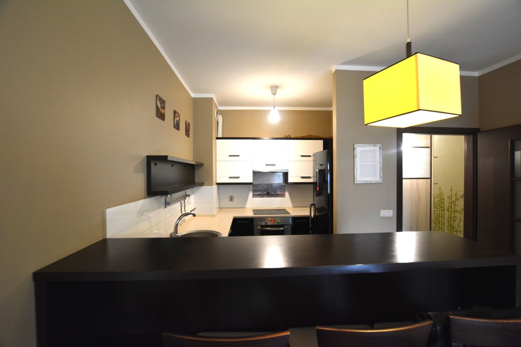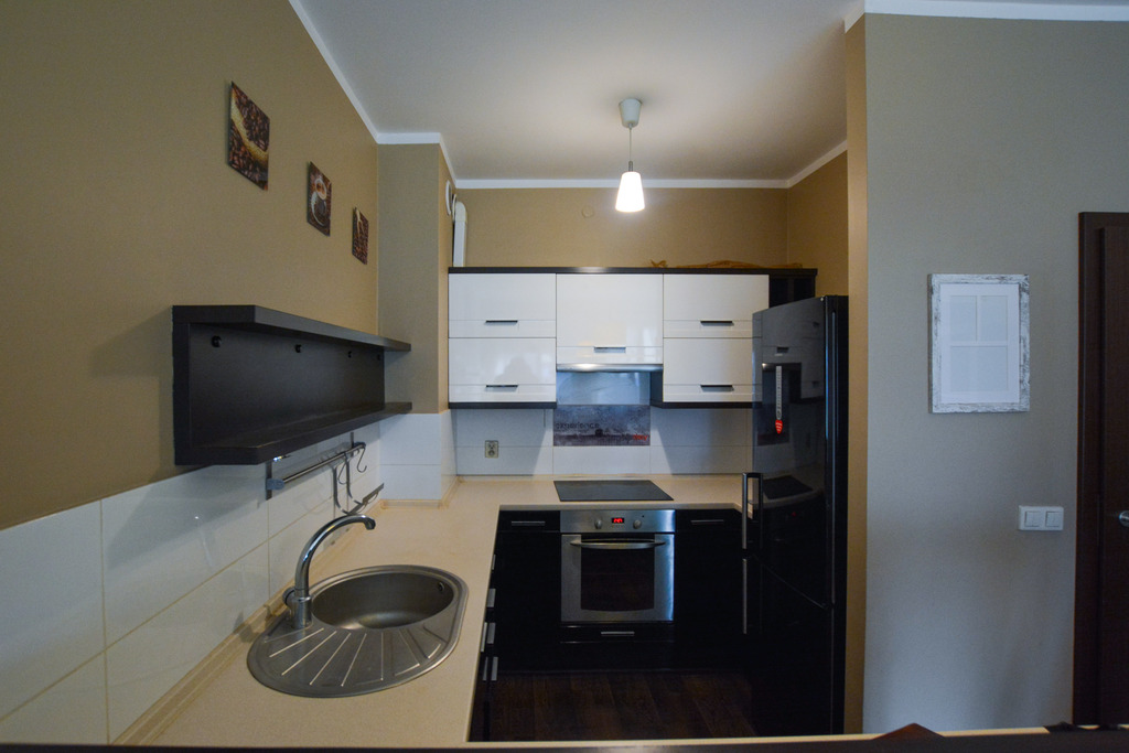 Kuchnia w formie aneksu wyposażona w meble i sprzęt AGD - lodówka, zmywarka, okap, płyta indukcyjna, piekarnik, czajnik.