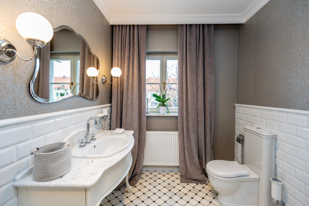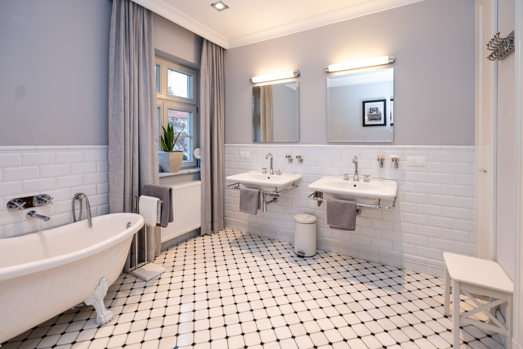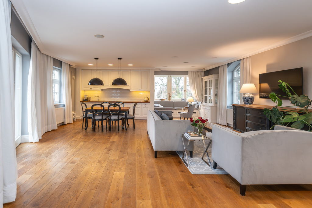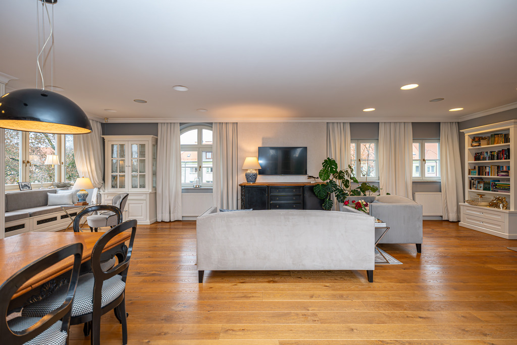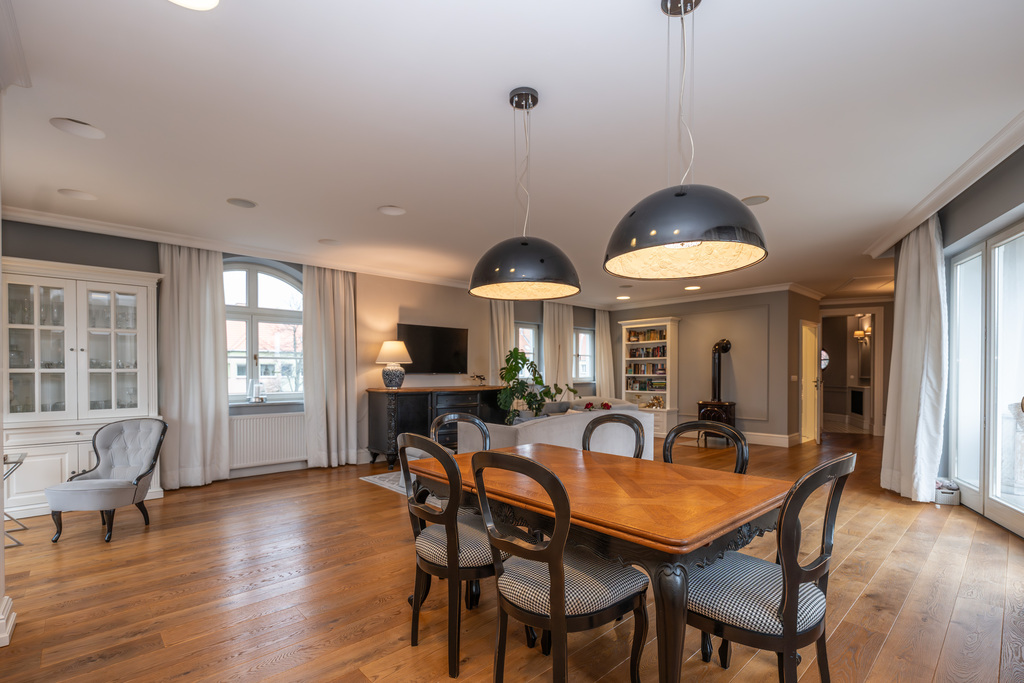 To wnętrze, które zachwyca dbałością o detal i ponadczasową klasą. Dominuje piękna, olejowana deska dębowa na podłogach, wysokie listwy przypodłogowe, sztukaterie ścienne i sufitowe, klasyczne proporcje pomieszczeń. Szaro-beżowa paleta barw przełamana głęboką zielenią i czernią, welurowe sofy, żyrandole w stylu glamour, kominek wolnostojący w salonie. Kuchnia otwarta na jadalnię w bieli i drewnie,. Łazienki wykończone marmurem i mozaiką w stylu retro (wanna wolnostojąca na lwich łapach, baterie w chromie).