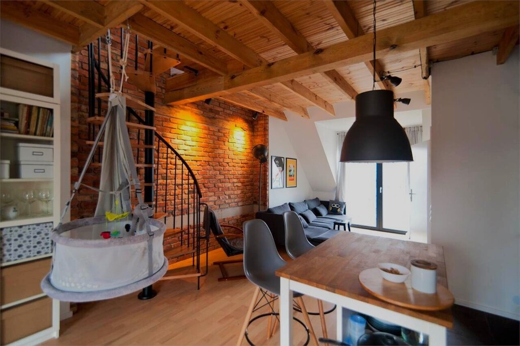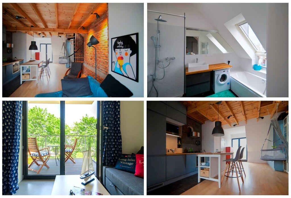 Na drugim piętrze znajdziemy 2 apartamenty o podwyższonym standardzie, w których funkcję sypialną przeniesiono na antresolę, dzięki czemu na dolnym poziomie dostępna jest dużo większa przestrzeń dzienna oraz łazienka z wanną oraz prysznicem. W pełnoprawnej kuchni znalazło się nawet miejsce na piekarnik i mikrofalówkę.
