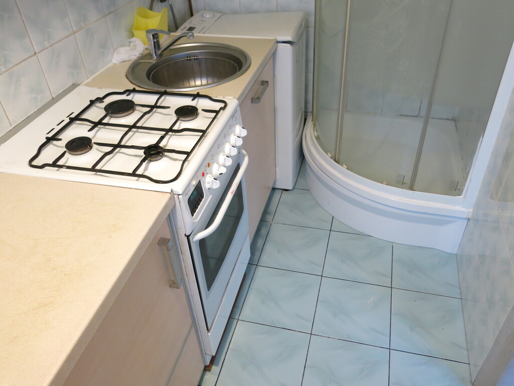 - kuchnię (w której zmieścił się prysznic i pralka),