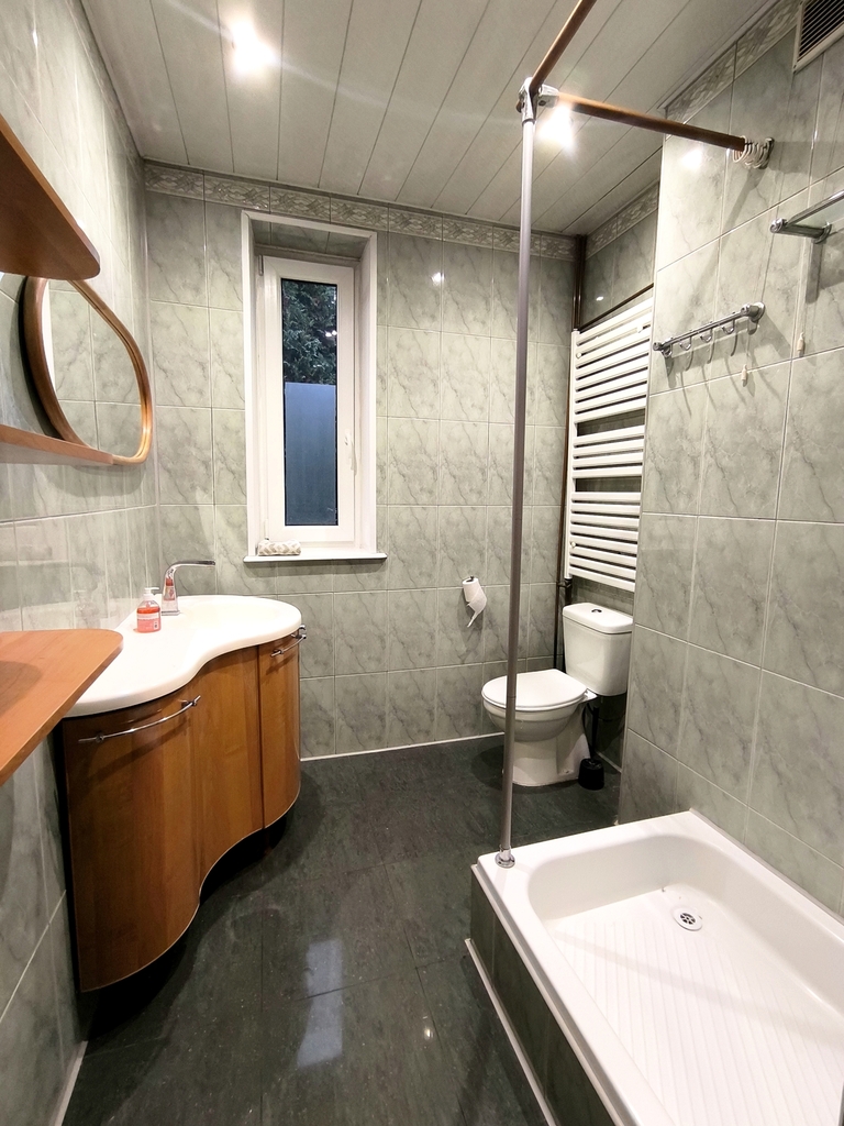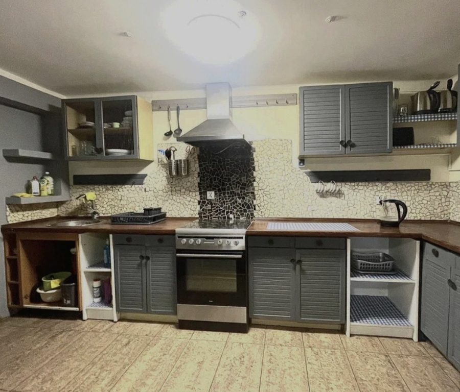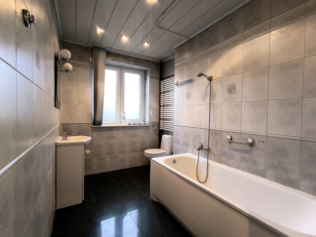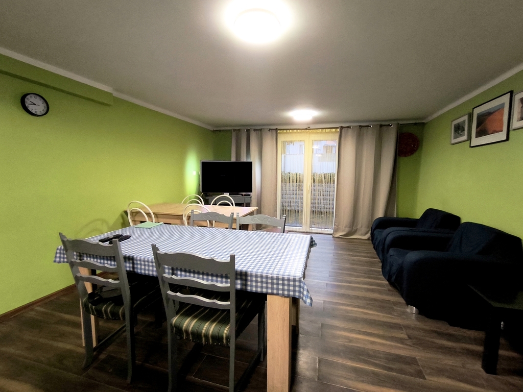 Piwnica: Przestronny pokój z kuchnią i wyjściem na taras od strony zachodniej, Drugi pokój z aneksem kuchennym i wyjściem na taras od strony wschodniej, WC z prysznicem, Pomieszczenie gospodarcze: pralnia, kotłownia, spiżarnia.