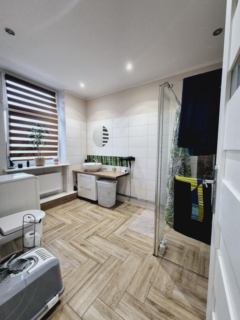 - dużej łazienki z wc, wykonana i wyposażona (kabina prysznicowa), na obecną chwilę łazienka wykonana - nie wpisana w księgę wieczystą,