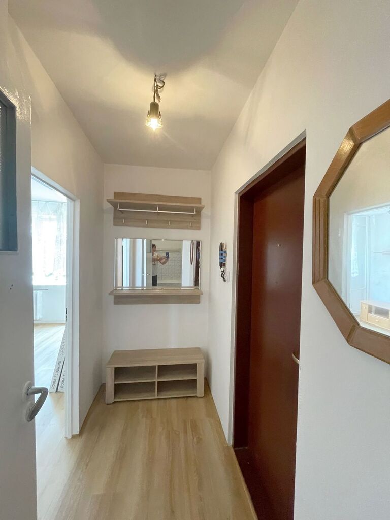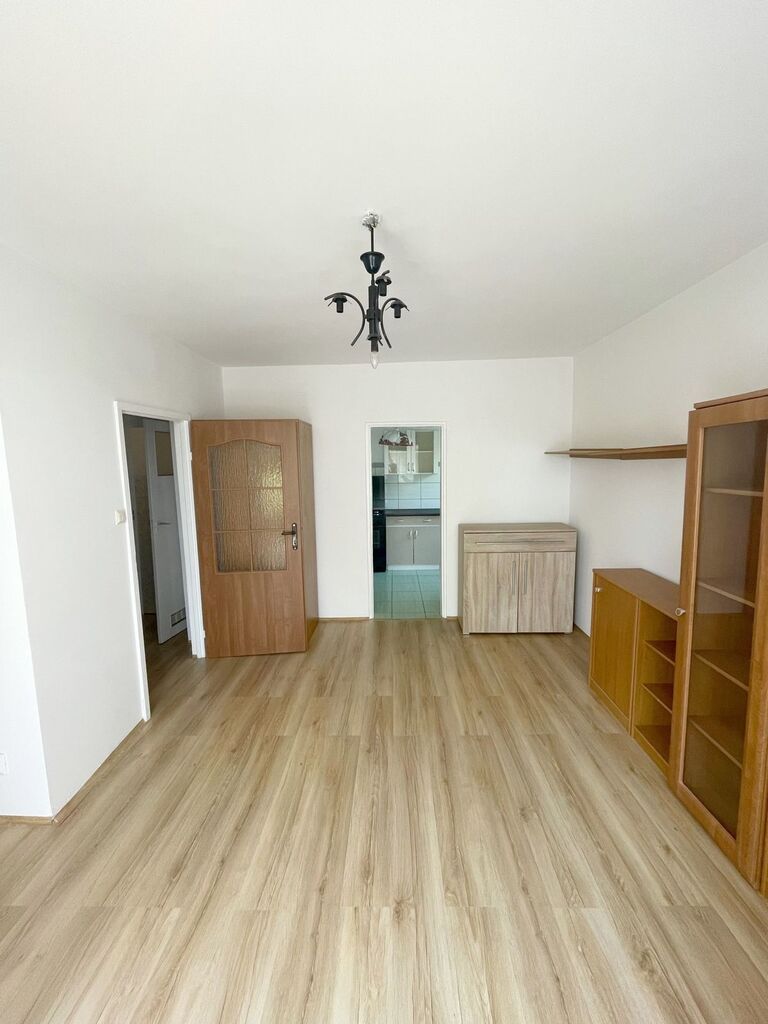 Na podłogach w pokoju i przedpokoju świeżo położone panele, ściany w tych pomieszczeniach wygładzone i pomalowane.