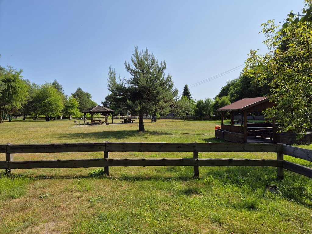 duża polana piknikowa z zadaszonymi wiatami do grillowania, placem zabaw i siłownią pod chmurką, a nawet pomostem do wędkowania lub cumowania łódek.