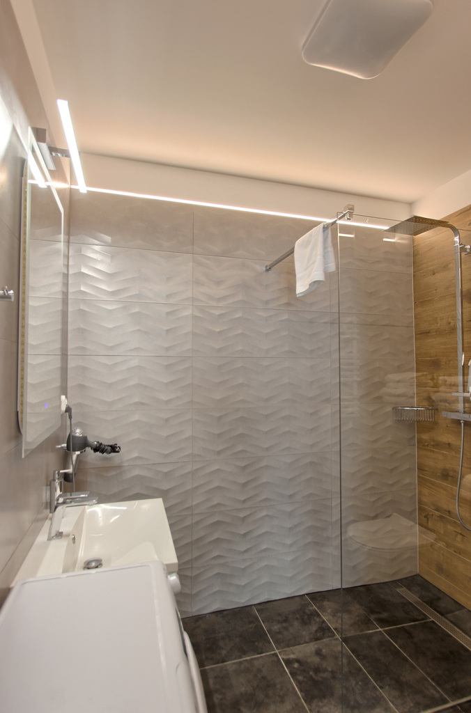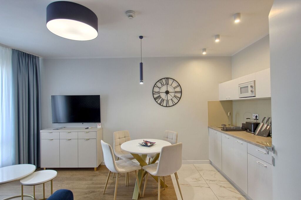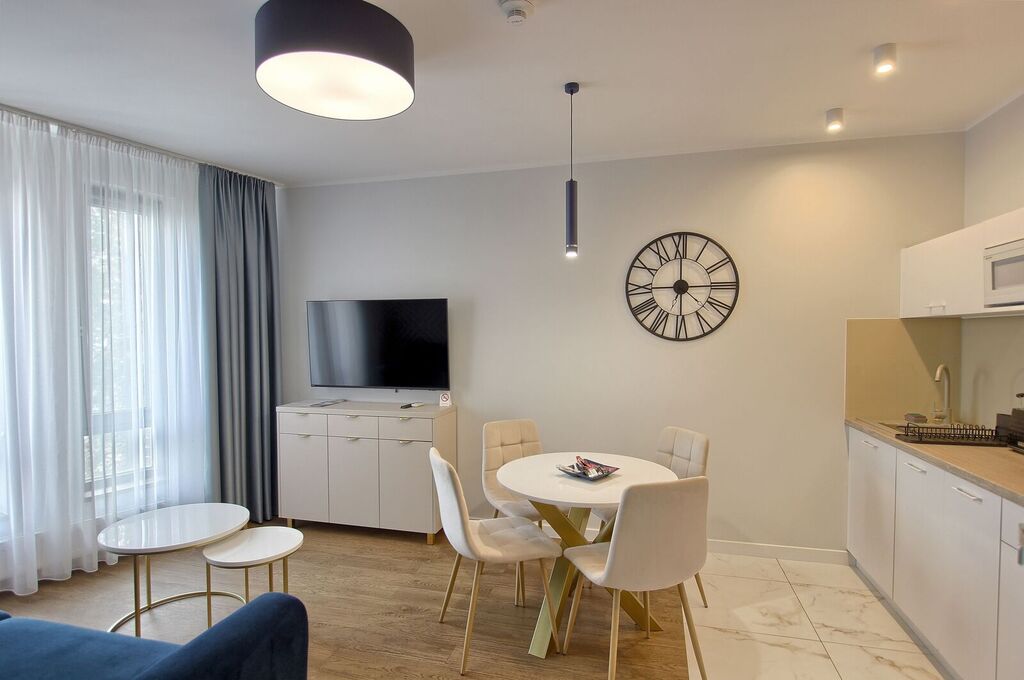 Szafy w zabudowie, telewizor, wyposażona kuchnia, pralka, kabina prysznicowa w łazience.