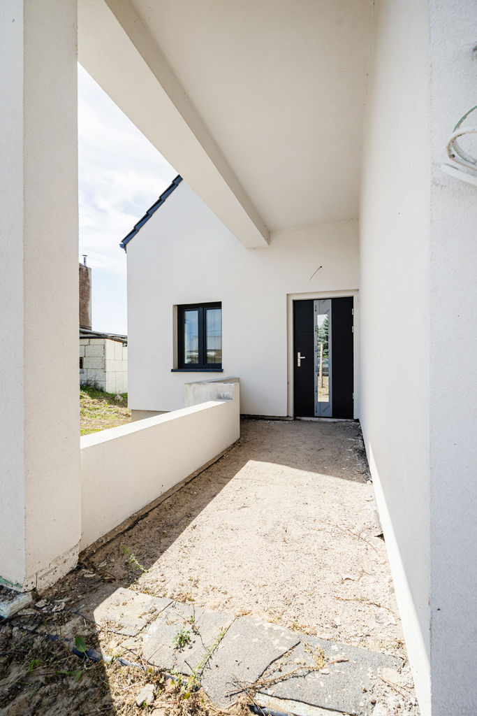 Dom wybudowany został z wysokiej jakości materiałów. Zastosowano trzyszybowe okna PCV z roletami zewnętrznymi oraz czujnikami alarmowymi, ściany wykonano z bloczków silikatowych i ocieplono styropianem grafitowym o grubości 20 cm, dach pokryty jest dachówką ceramiczną Roben, a poddasze przygotowane jest do docieplenia. Wnętrza wykończono tynkiem silikonowym, okna, rynny i dachówka są w kolorze antracytowym. Zainstalowano ogrzewanie podłogowe gazowe, które jest już uruchomione i działające, wykonano podłączenie do sieci kanalizacyjnej, rozprowadzono instalacje pod alarm, monitoring, domofon oraz bramę wjazdową. Garaż wyposażony jest w bramę automatyczną. Wykonana została instalacja deszczowa z możliwością zagospodarowania wody do podlewania ogrodu lub oczka wodnego.