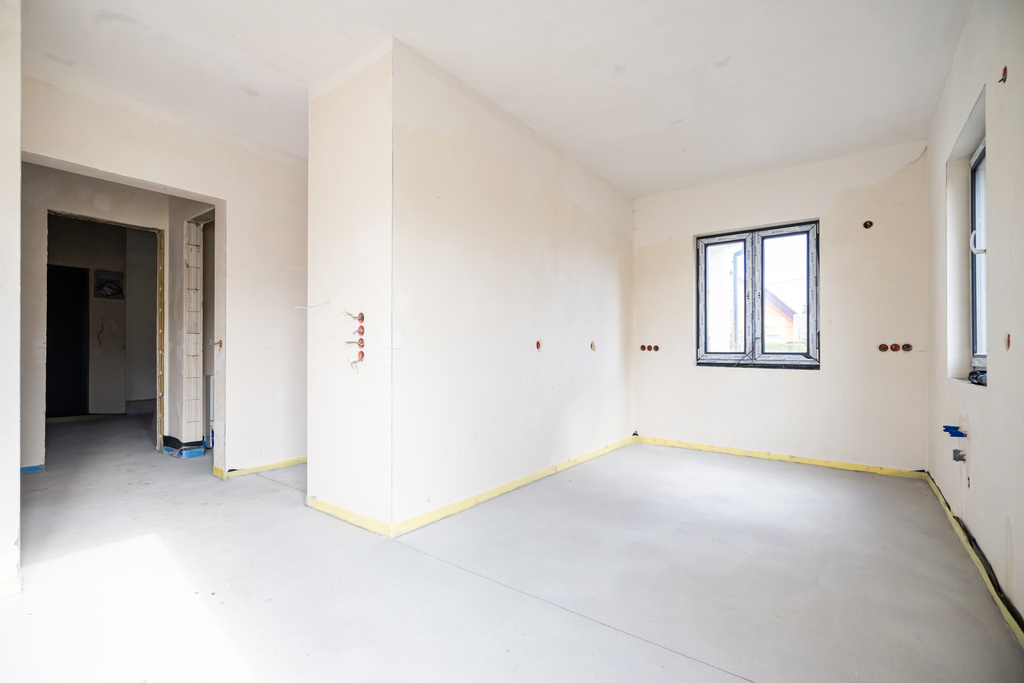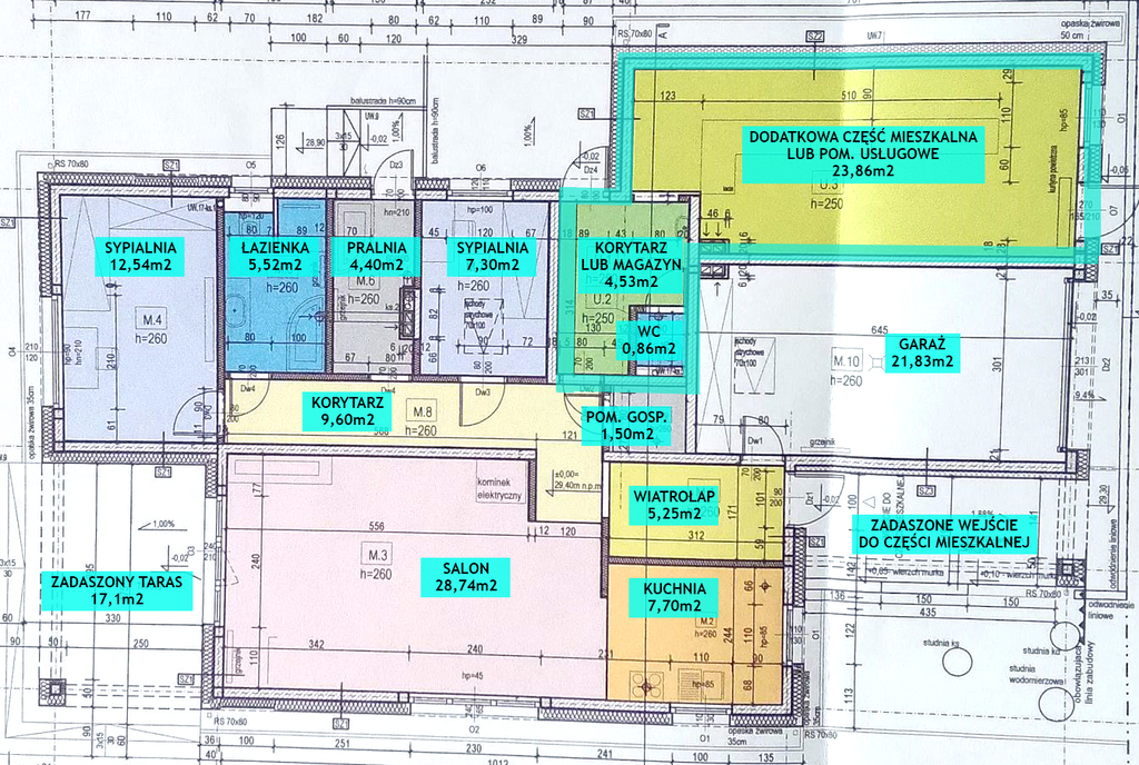 Nieruchomość posiada dodatkową powierzchnię mieszkalną lub usługową o powierzchni około 30 m2. Dom składa się z otwartego salonu o powierzchni 28,74 m2, kuchni 7,70 m2, przestronnej sypialni 12,54 m2, pokoju 7,30 m2, łazienki 5,52 m2, pralni z WC i wyjściem na zewnątrz 4,40 m2, korytarza 9,60 m2, wiatrołapu 5,25 m2, pomieszczenia gospodarczego 1,50 m2, garażu 21,83 m2 oraz zadaszonego tarasu z przesuwnymi drzwiami HS o powierzchni 17,1 m2.