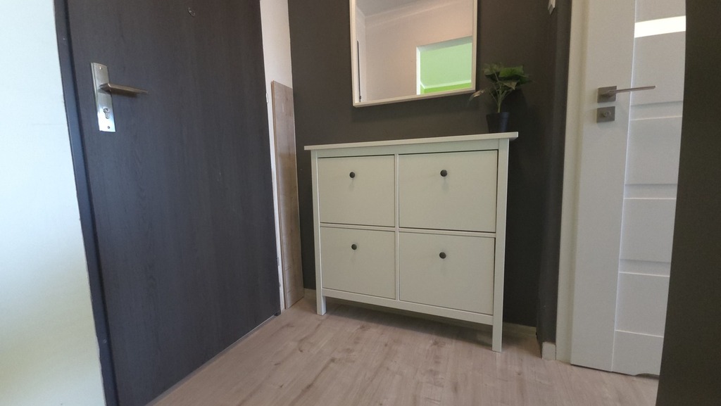 Korytarz z praktyczną szafką na buty i szafą na odzież.