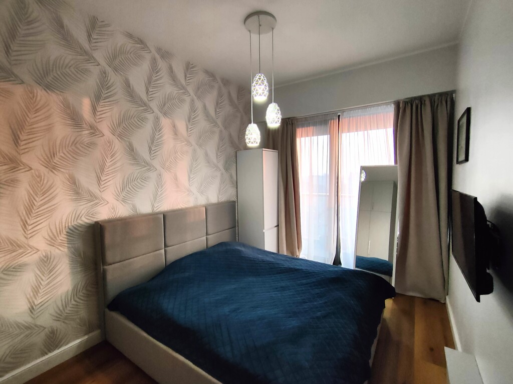 Kuchnia została wykonana z dbałością o funkcjonalność i estetykę — drewniana zabudowa, czarne detale i dobrze rozplanowane oświetlenie tworzą elegancką całość. Sypialnia, oddzielona od salonu, zapewnia prywatność i również posiada wyjście na loggię, co optycznie powiększa przestrzeń.