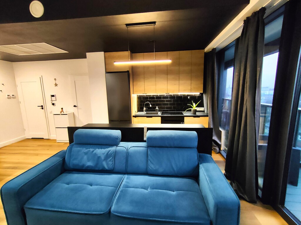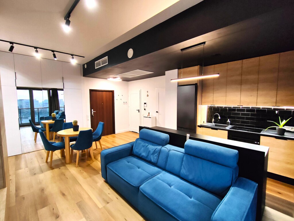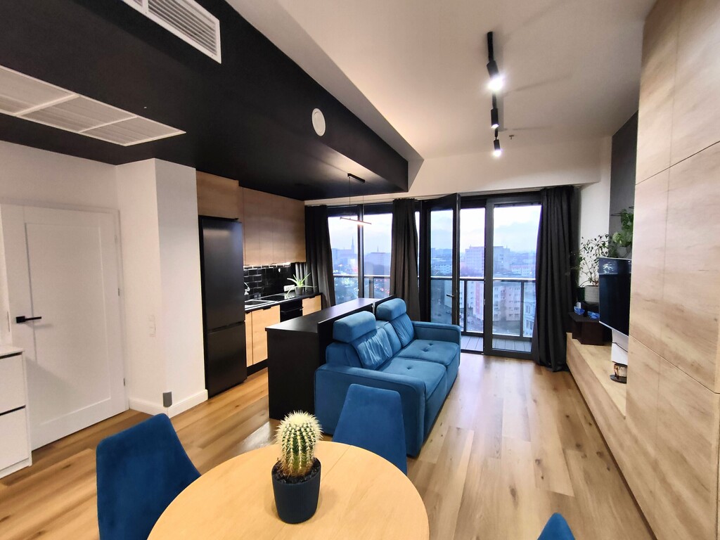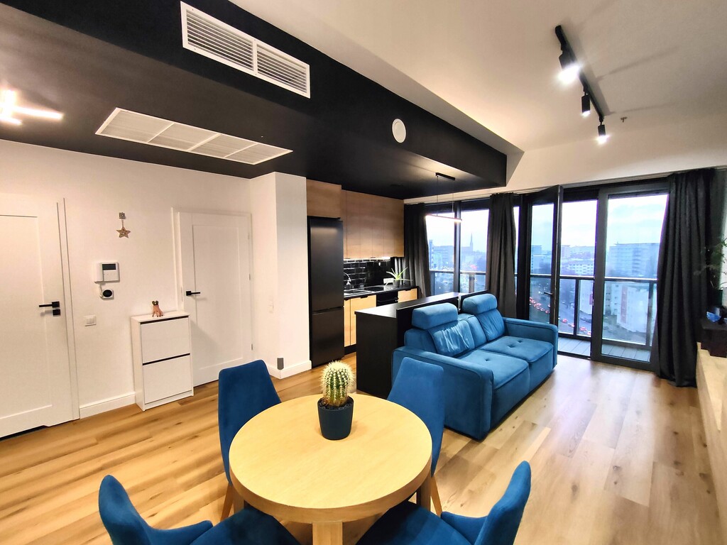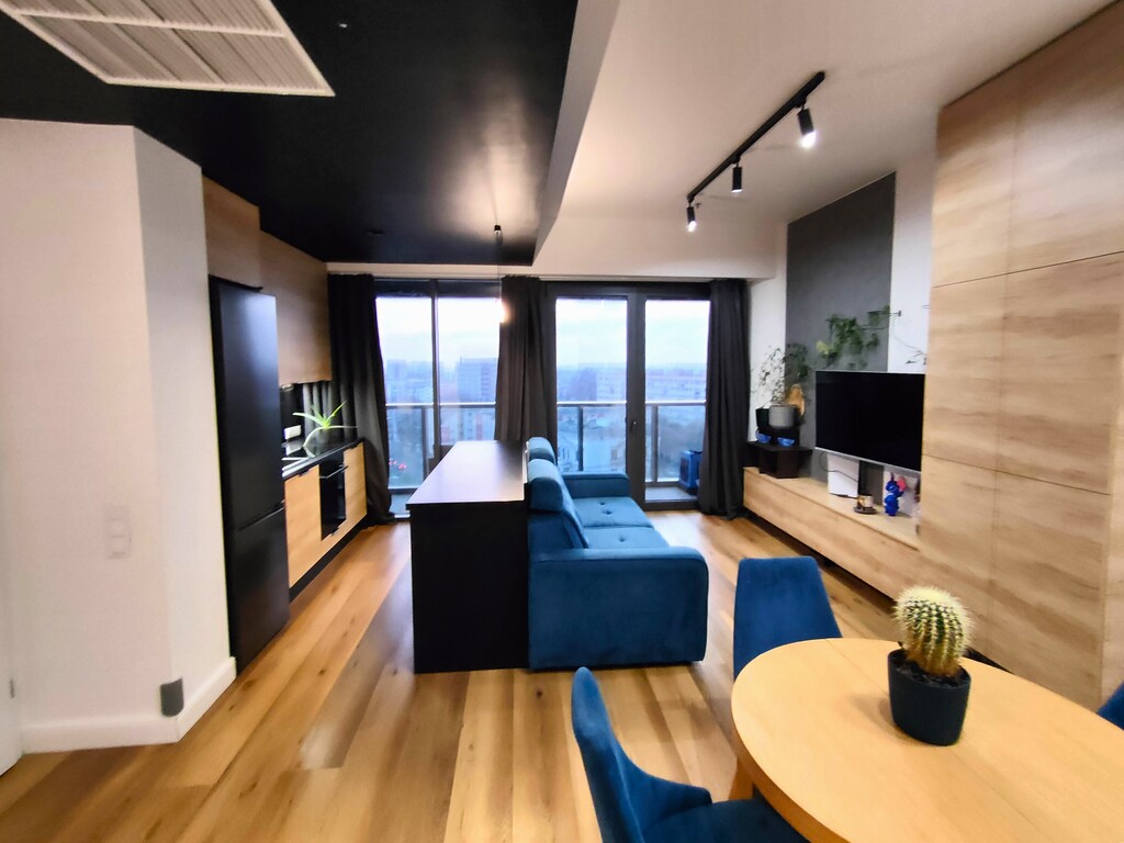 Opis mieszkania Apartament wykończony w nowoczesnym, spójnym stylu, z wykorzystaniem materiałów wysokiej jakości. Jasny salon połączony z aneksem kuchennym tworzy komfortową, dobrze doświetloną przestrzeń dzienną. Duże przeszklenia prowadzą na loggię i zapewniają atrakcyjny widok na centrum miasta.