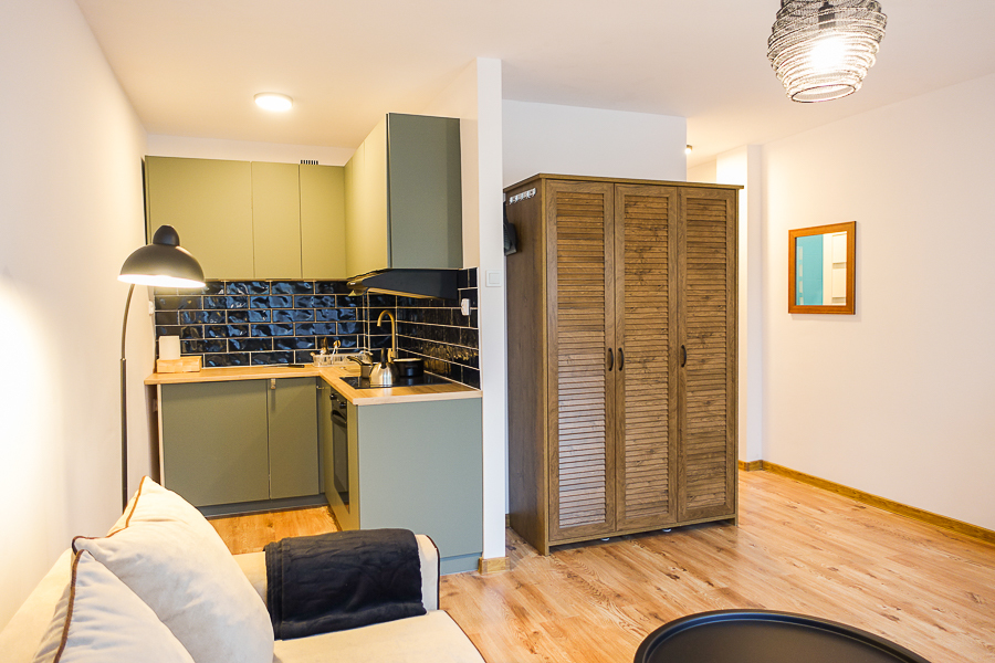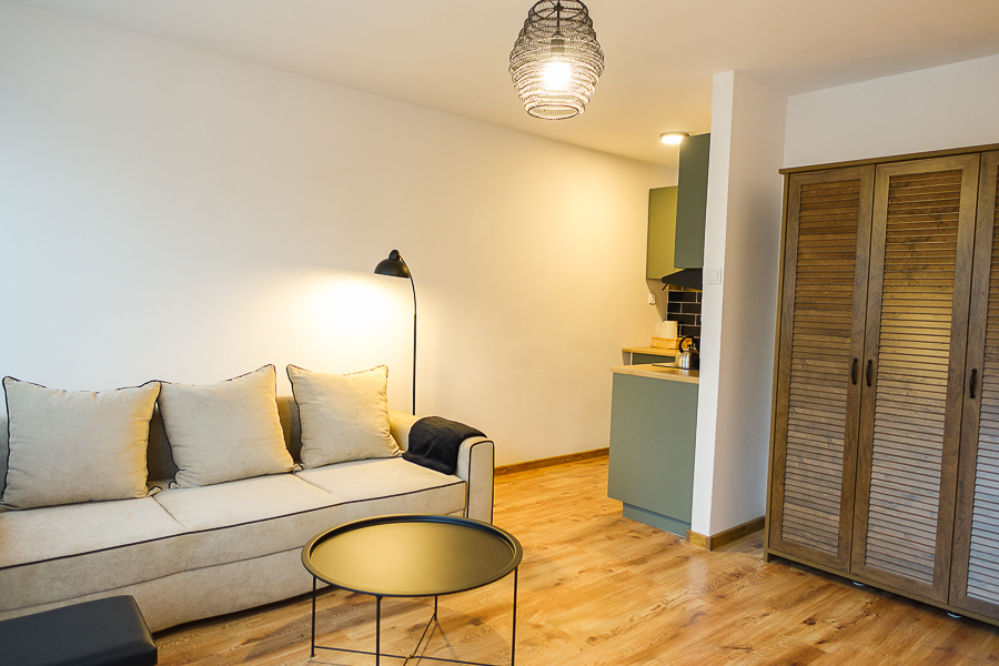 OPIS MIESZKANIA: Mieszkanie umeblowane. W pokoju szafa trzydrzwiowa, komoda, kanapa 2-osobowa, stolik. Pokój z aneksem kuchennym. Kratka balkonowa, ale balkonu nie ma. W aneksie nowa zabudowa meblowa, nowe urządzenia: płyta grzewcza ceramiczna, piekarnik, zlewozmywak, pochłaniacz. W łazience wanna, umywalka, compact, nowa pralka, glazura i terakota. Okna PCV, drzwi wejściowe nowe.