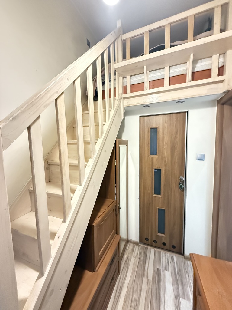 - schody na antresolę gdzie znajduje się łóżko dwuosobowe (1,4 m) z materacem,