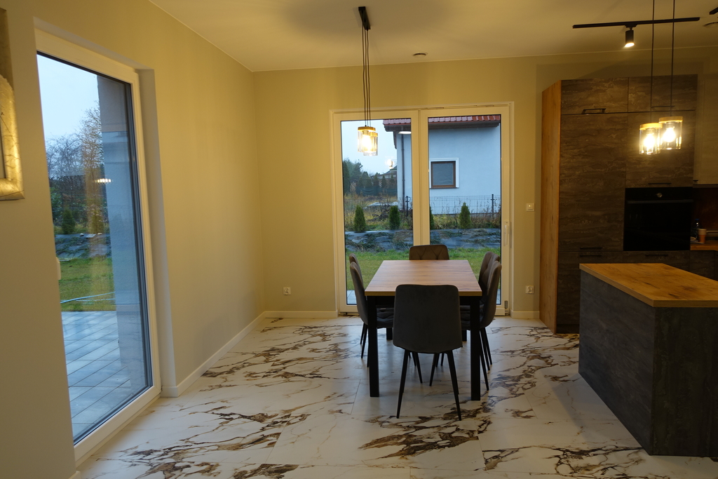 Dom ma bardzo korzystny rozkład pomieszczeń i jest wykończony w bardzo dobrym standardzie.