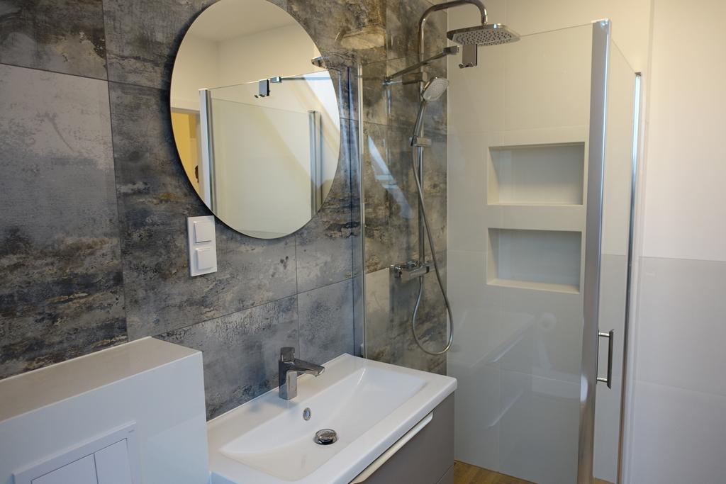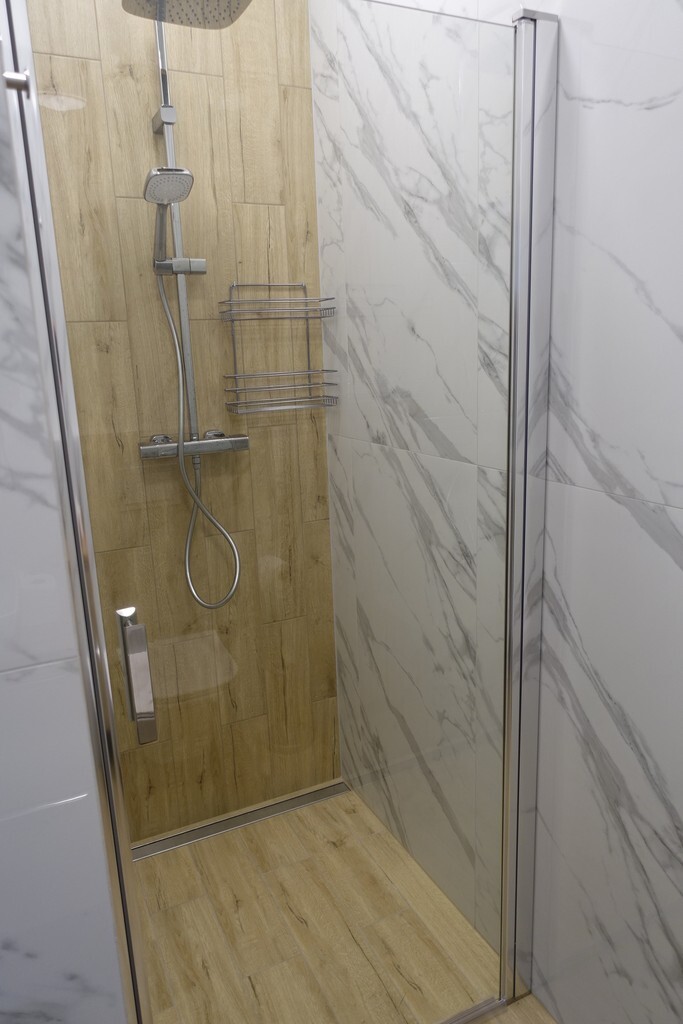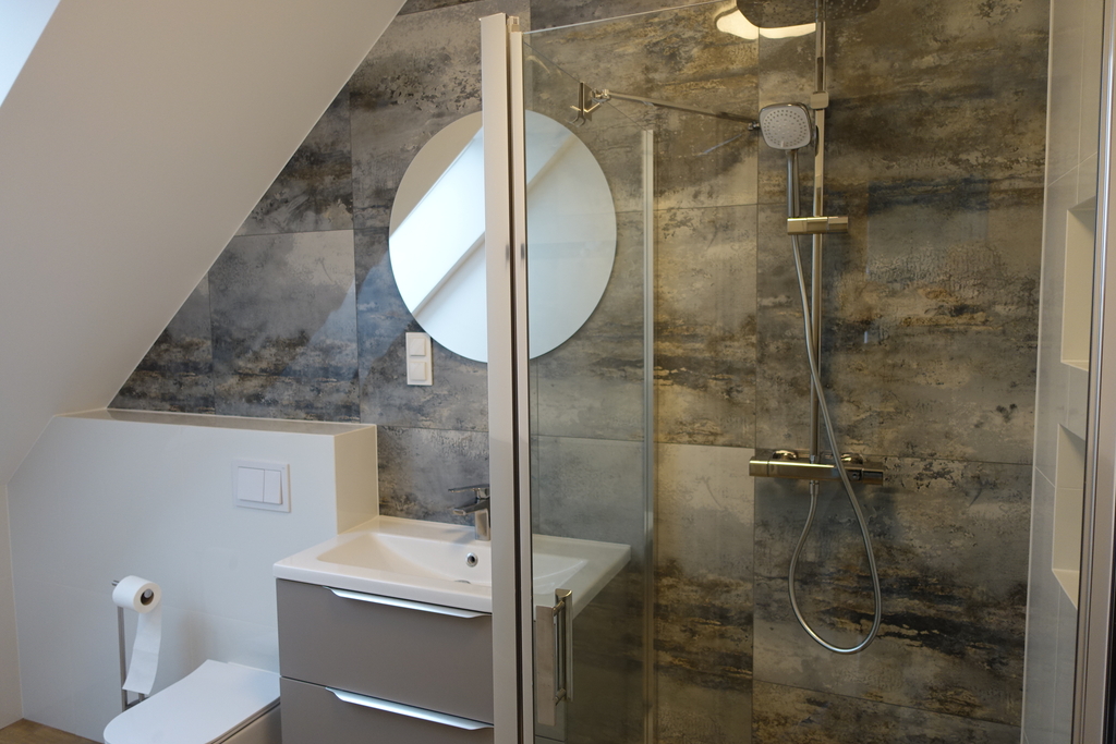 - łazienka 3,3 m2 w glazurze i terakocie wysokiej jakości, prysznic, umywalka, WC.