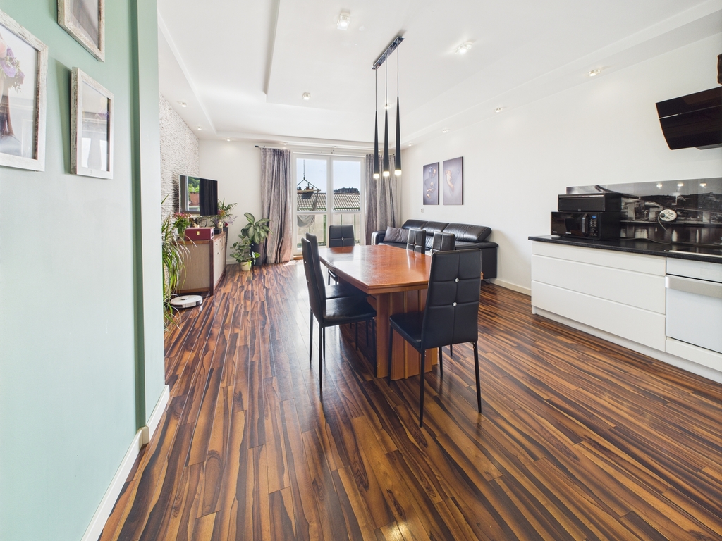 * Salon z aneksem kuchennym – otwarte, dobrze doświetlone pomieszczenie łączące strefę wypoczynku z jadalnią, idealne do wspólnych spotkań.