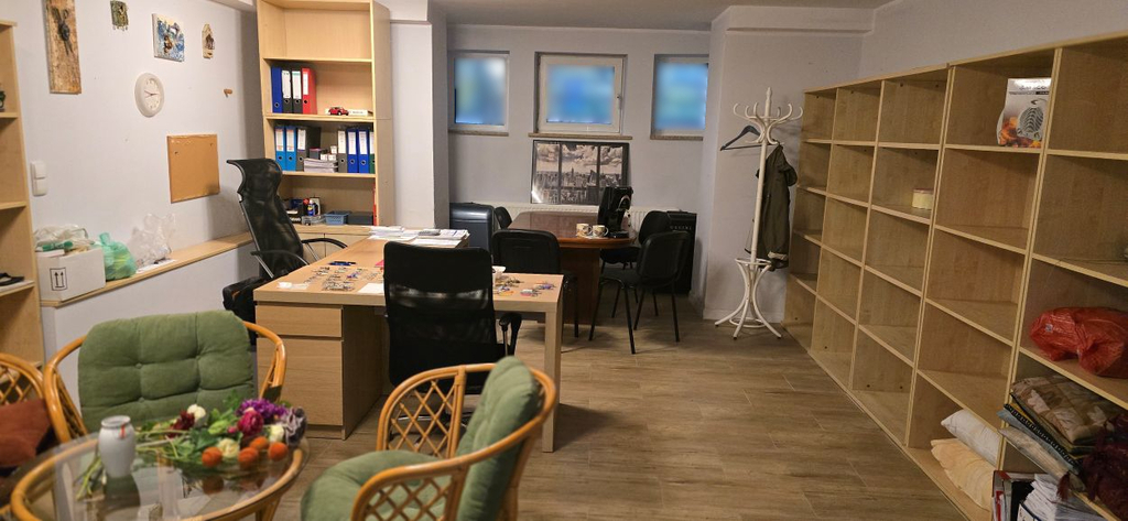 Dwa odrębne wejścia do lokalu. Częściowe umeblowanie (poza regałami widocznymi w jednym z pokoi).